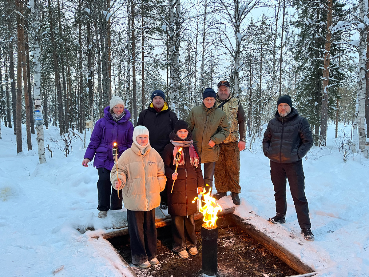 …В феврале ещё короткий световой день. Поэтому во времени мы были ограничены. Хоть и ходят на факела и ночью и днём, но нам хотелось пройтись пока светло. Все-таки пока идешь по лесу, также любуешься окружающей красотой, рассматриваешь звериные следы на снегу, вон зайца след, а рядом лисы. Следы свежие, так как на кануне выпало много снега. Тропа по лесу проложена шикарная, идти легко, совсем не проваливаешься, хорошо утоптана, сразу видно место популярное. Мы совсем недавно узнали о факелах, ещё в прошлый год все хотели попасть, но не решились. Все говорили уж очень далеко идти до них, а летом и вовсе не попасть, только на лодке переплывать. Мы уже были готовы и на снегоходах до них ехать, но сорвалось и хорошо. Все в шаговой доступности. А когда и компания большая, то совсем близко). …так откуда в лесу взялись вечногорящие факела? …это следы бывшего радиевого промысла. Было пробурено от 300 до 400 скважин. Вода залегала на глубине 300-400 метров, газ располагался выше
