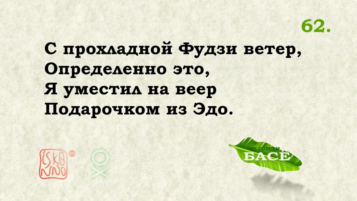 Подарочком из Эдо. Очень легкое стихотворение и по форме, и по ощущениям. Первая строка проблем с переводом не вызывает: «ветер {с} Фудзи». А вот со второй строкой возможны варианты. [оги] (с долгим [о]) — это «веер» в складном варианте конструкции. И именно «веер» служит в хайку «сезонным словом», обозначая жаркое время года. А вот [носэтэ], записанное по звучанию слоговой азбукой, а не по смыслу иероглифами можно понять как «разложить», «развернуть» (предварительно сложенное), а можно перевести как «положить {что-то} сверху {того, о чем говорится}». Эта небольшая игра слов — не главный прием текста, просто забава Басё. Да, веер можно разложить, но еще в Японии есть традиция почтительного подношения презентов на развернутом веере и этот смысл здесь предпочтительнее. Третья строка начинается словом [эдо], это топоним, нынешний город Токио, а завершается словом [миягэ] — «подарок» или «
