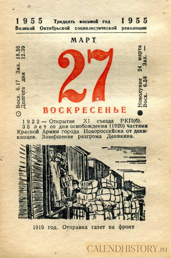 Итак, сегодня 27-го марта и у нас на календаре 1955-й год. Перед нами листок советского календаря Политиздата. На календаре у нас воскресенье - 27 марта 1955-го года. 1919 год. Отправка газет на фронт 1922 — Открытие XI съезда РКП(б). 35 лет со дня освобождения (1920) частями Красной Армии города Новороссийска от деникинцев. Завершение разгрома Деникина. *** Оборотную сторону листка этого календаря можно посмотреть у нас по ссылке на сайте. Другие листки советских календарей смотрите у нас на сайте - CALENDHISTORY.ru ПОСМОТРИТЕ ЕЩЁ ЛИСТКИ ОТРЫВНЫХ КАЛЕНДАРЕЙ:
