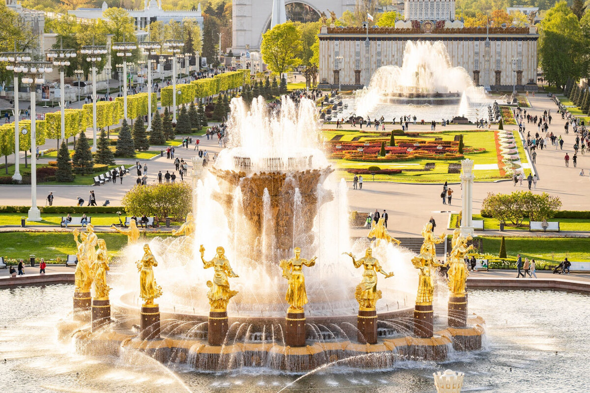 Величественные фонтаны — узнаваемые символы ВДНХ, да и Москвы в целом. Тысячи туристов со всей страны каждый год приезжают сделать запоминающиеся снимки с архитектурными жемчужинами Выставки. В ходе программы «Возрождение ВДНХ» три главных фонтана отреставрировали, восстановили утраченные детали и сделали художественную подсветку. Этот архитектор родился в 1905 году в Тбилиси. Строительство зданий было его мечтой с детства, и она сбылась. По его проектам был возведен комплекс домов в Ленинграде, а в Москве построено несколько мостов. Но его самые известные архитектурные произведения — фонтаны «Дружба народов», «Каменный цветок» и «Золотой колос». Изящные скульптуры девушек, покрытые сусальным золотом, окружают фонтан «Дружба народов». Фигуры символизируют советские республики. В одеждах, головных уборах и украшениях угадываются национальные черты. В руках девушки держат виноград, пшеницу, яблоки и другие плоды, растущие в разных регионах страны. Центр этого фонтана — чаша в виде цветка