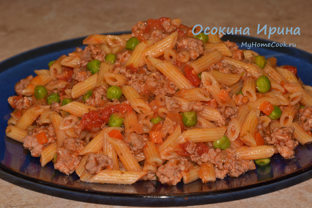 Сегодня у нас блюдо из разряда быстрых и питательных: в сотейнике обжарила 2 рубленные луковицы, добавила 1 довольно крупную морковь кубиком, обжарила, добавила 400 г бараньего фарша, обжарила, разбивая комочки, затем добавила 1 банку (400 г) очищенных резаных консервированных помидоров, 1 ч.л. сушеного орегано, щепоть чили и тушила 5 минут, затем добавила 200 г замороженного зелёного горошка, промешала, прогрела, затем добавила 200 г пасты (у меня сегодня мини-пенне) и снова помешала и прогрела, а затем сразу подала. Очень вкусно, сочно и сытненько) Приятного аппетита