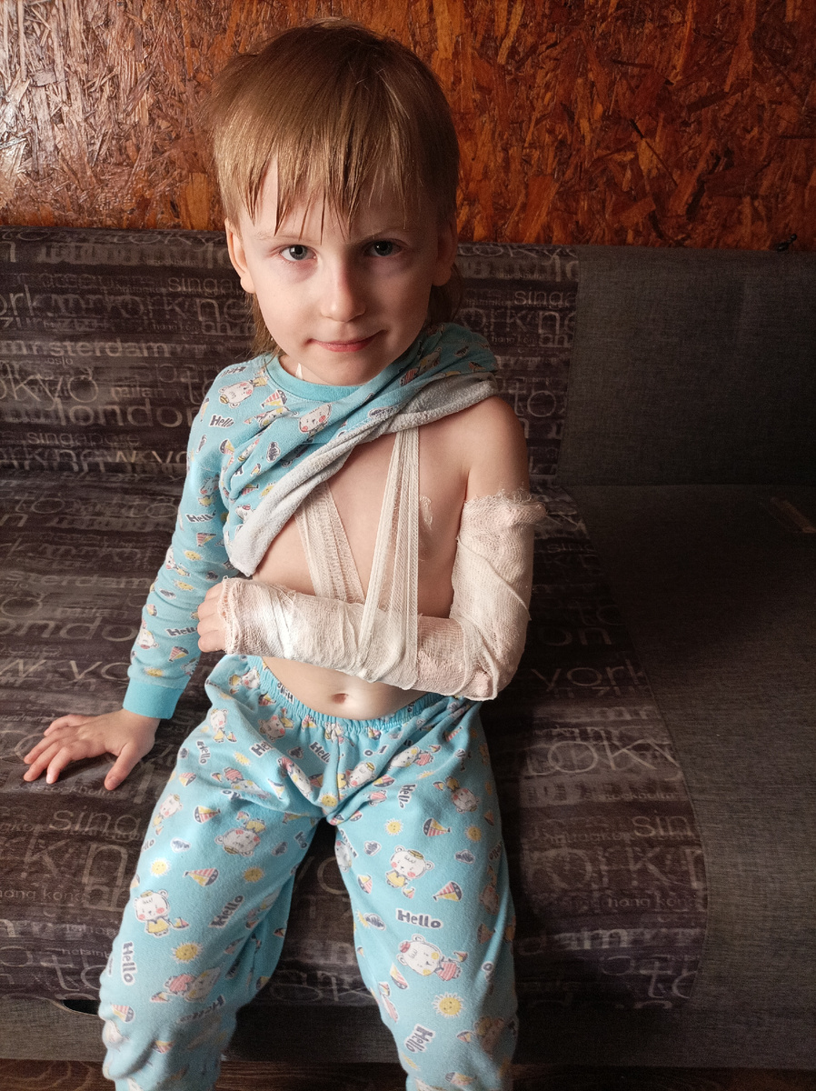 Сейчас ребёнок уже забыл, что рука у него болела. И приходится на него рыкать, чтобы не вынал её из повязки. А то забывается и хочет вновь бегать и беситься с остальными.