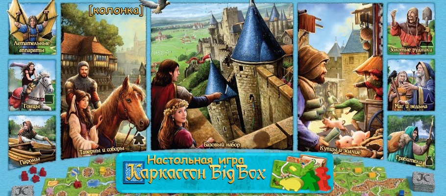 В конце 90-х, когда речь заходила о настольных играх, пределом мечтаний для большинства был легендарный «Менеджер» во всевозможных вариациях. Несмотря на разнообразные красочные обложки, суть игры всегда оставалась неизменной – кидаем кубик, ходим по полям, скупаем компании или акции и надеемся на удачу, чтобы сопернику не посчастливилось попасть на чужую территорию и раскошелиться. Секрет успеха «Менеджера» заключался в максимально простых и понятных правилах, а также минималистичных и эффективных механиках. Не последнюю роль играл элемент удачи, добавлявший каждой партии остроты и азарта. После взгляда в прошлое текущее разнообразие настолок просто поражает воображение и, если по каким-то причинам ранее вы не успели приобщиться к настольному братству, «Каркассон» может стать отличным выбором для знакомства с удивительным миром настолок. «Каркассон: Big Box» полностью соответствует своему названию и представляет из себя большой набор, в который помимо оригинальной игры входит одинна