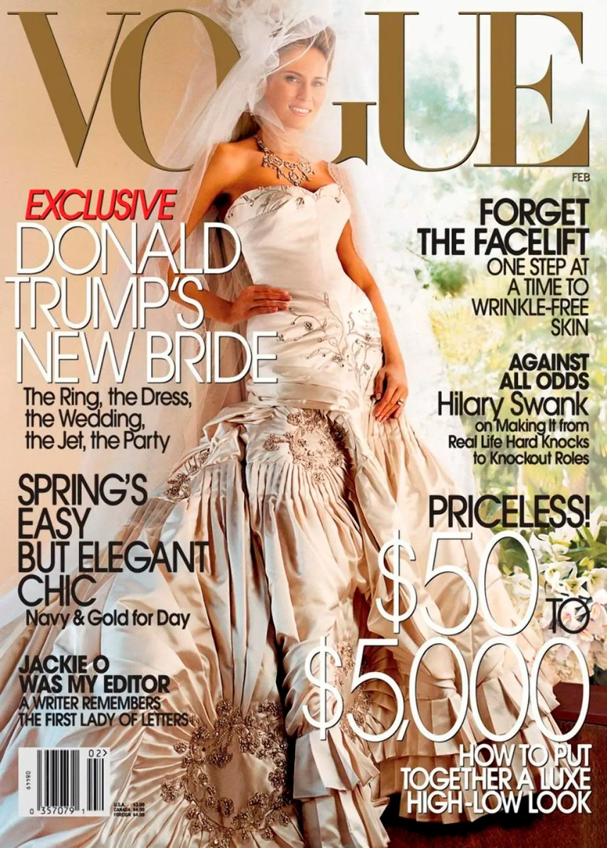 Мелания была запечатлена в этом платье на обложке Vogue в феврале 2005 года после своей свадьбы в Палм-Бич. Экстравагантный образ был сшит из 90 метров белого атласа в оттенке дюшес и вручную расшит хрустальными бусинами в течение 550 часов. Как писали в статье в Vogue, наряд весит целых 27 килограммов.