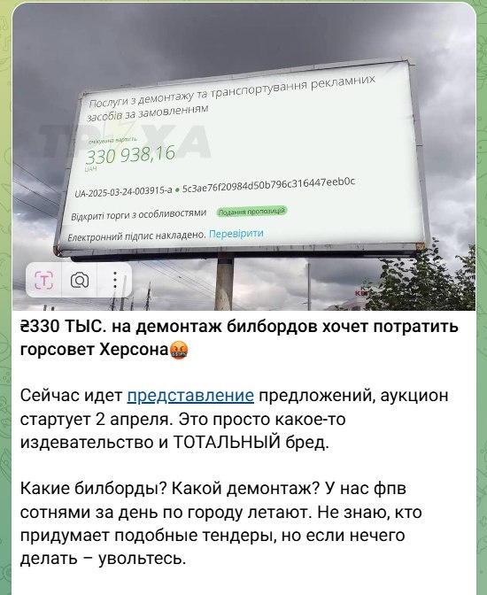 В условиях, когда многим херсонцам приходится буквально выживать без света и отопления в повреждённых домах, городской совет беззастенчиво тратит сотни тысяч гривен на демонтаж билбордов, которые вряд ли сильно искажают ландшафт города-призрака. Деньги, которые могли пойти на реальную помощь людям, снова собираются потратить на сомнительный подряд, которой, быть может, даже не будет реализован – все мы знаем, как правобережные чиновники любят «пилить» бюджет.
