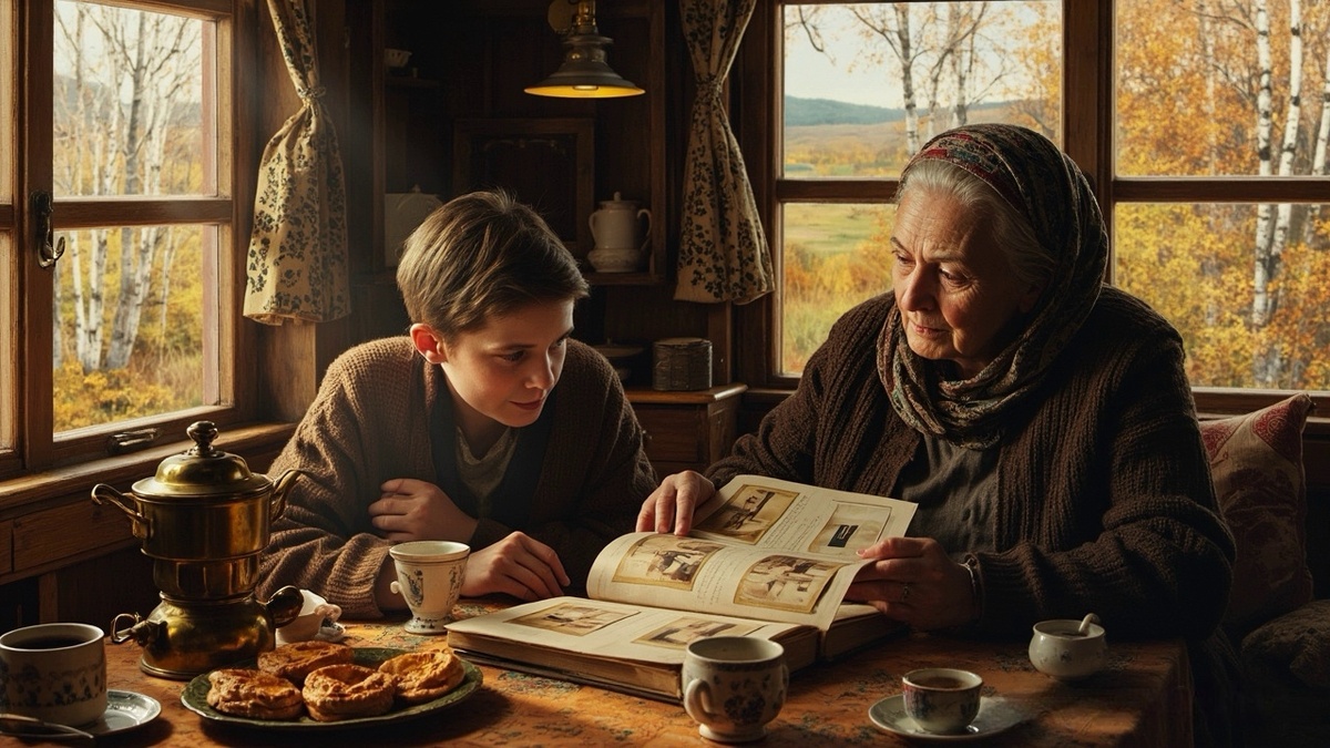 За окном тихо постукивал осенний дождь, а в избе пахло свежеиспеченными пирогами с капустой. Я сидел за кухонным столом, согревая ладони о фарфоровую чашку с мятным чаем, когда бабушка Таня бережно достала с верхней полки потрепанный альбом в бархатном переплете. "Вот, посмотри шпиён, - сказала она, осторожно перелистывая пожелтевшие страницы, - это же целая жизнь..." Первая фотография - юная девушка с двумя толстыми косами в белом платье, стоящая среди колосьев. "Это я на уборке урожая в 1965 году, - улыбнулась бабушка. - Мы тогда всем колхозом выходили, пели песни, а вечером у костра рассказывали истории..." Я аккуратно касался уголков фотографий, пытаясь представить эту хрупкую девушку с ясными глазами в образе моей суровой, но доброй хозяйки. Следующий снимок заставил бабушкины глаза заблестеть особо - молодой человек в строгом костюме держал в руках гармонь. "Сережа. Мы познакомились в сельском клубе. Он так играл "Катюшу", что все девушки вздыхали, но пригласил на танец именно ме