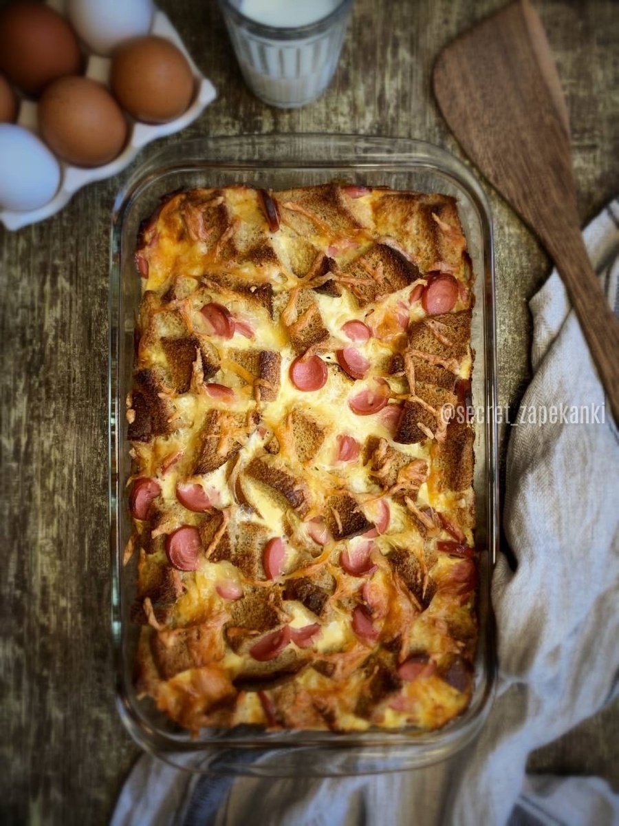 Страта – по своей сути хлебная запеканка с американским акцентом. Кремовая внутри с хрустящей зажаристой корочкой снаружи. Очень простая в исполнении, незатратная по времени и средствам и ооочень сытная. Основа любой страты – хлеб, яйца, сыр и молоко. Остальное легко настраивается под наши запросы. Мясные начинки – сосиски, бекон, карбонад… Овощи, грибы, зелень – не проблема. Хлеб тоже можно выбрать тот, который больше нравится или есть в наличии. Белый, серый, обычный батон. Главное не брать супер свежий, больше подойдёт немного залежалый. Такой вот обычный необычный завтрак. Готовим: - хлеб 200-250 г (у меня серый) - сосиски сливочные 400 г - сыр 200 г - яйцо СО 6 шт. - молоко 400 мл - соль, перец - масло растительное для формы Форма 34*21*5 см, объёмом 2,2 л. Венчик, лопатка. Духовку разогреваем до 180С. Хлеб нарезаем на кусочки прямоугольной формы. Сосиски колечками, сыр натираем на крупной тёрке. Перекладываем в глубокую миску и перемешиваем лопаткой. Оставляем ~