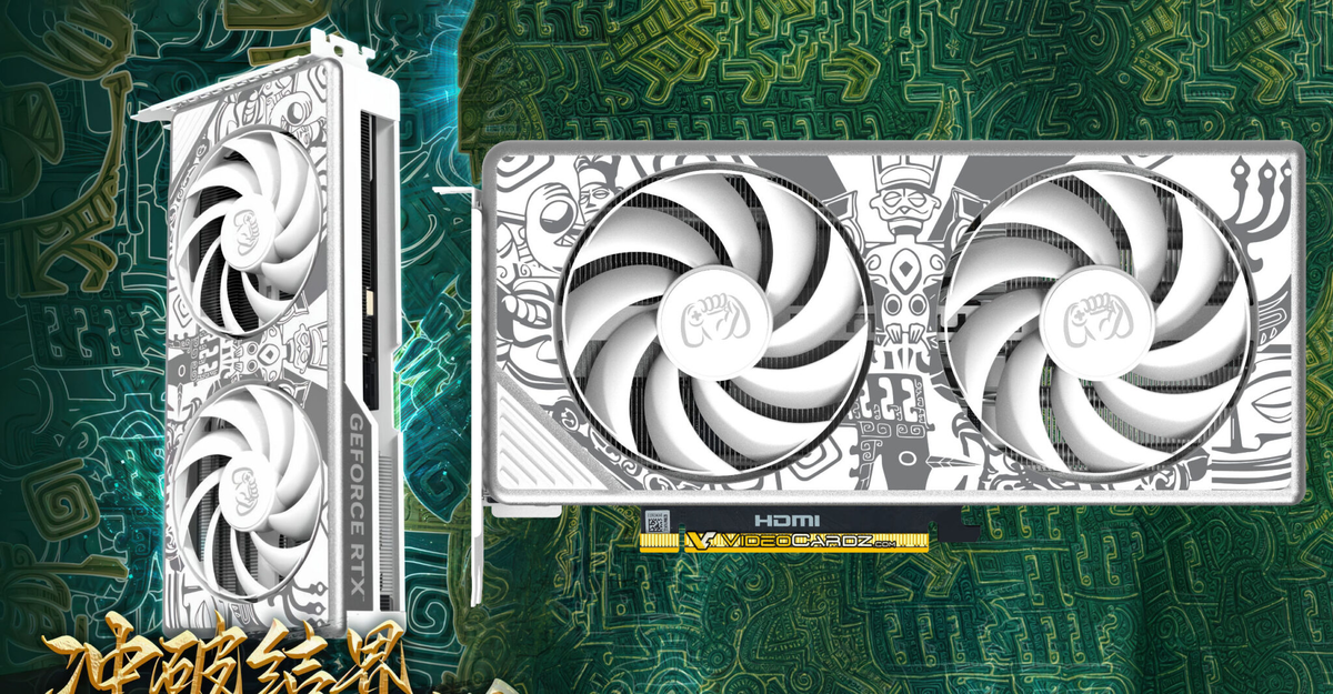 источник изображения: videocardzAXGaming — дочерний бренд компании Inno3D, представленный на китайском рынке. Основной акцент сделан на современный дизайн, включающий видеокарты белого цвета. Продукты AXGaming используют программное обеспечение TunIT, разработанное Inno3D. источник изображения: videocardzЛинейка RTX 50 выполнена в единой белой цветовой гамме. Особое внимание привлекает модель RTX 5070 Esports Edition X2W, которая выделяется уникальным дизайном с граффити, стилизованными под элементы культуры майя. источник изображения: videocardzСистема охлаждения «Punk 4.0» выполнена в формате двойного слота с габаритами 240×120×41 мм и включает двухвентиляторный кулер. Конструкция оснащена пятью тепловыми трубками, расположенными под защитным кожухом. На рендерах присутствует подсветка вокруг вентиляторов, которая, вероятно, служит для визуализации работы системы, а не является функциональным элементом. Карта основана на печатной плате модели Twin X2 от Inno3D, что предусматривает ис