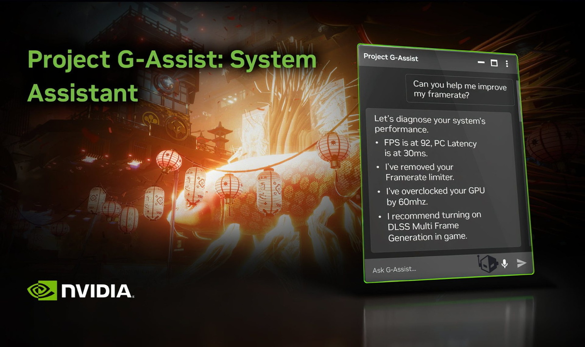 NVIDIA представила Project G-Assist — AI-помощник, призванный изменить взаимодействие пользователей с компьютерами. Этот проект впервые был анонсирован на выставке Computex 2024 и теперь доступен для геймеров. G-Assist основан на языковой модели с 8 миллиардами параметров и работает локально, не требуя подключения к облаку или платной подписки. Проект G-Assist способен помогать игрокам с настройкой графического процессора и игровыми параметрами в режиме реального времени, используя текстовые или голосовые команды. Например, помощник может диагностировать узкие места системы, оптимизировать настройки игры, повышать эффективность питания и даже разгонять видеокарты. Для анализа производительности система может считывать внутриигровые метрики и представлять результаты в удобочитаемых графиках. Пользователи могут вызывать меню G-Assist нажатием комбинации клавиш Alt+G и вводить запросы с помощью текста или голоса. NVIDIA предлагает список примеров запросов, которые можно использовать с пом
