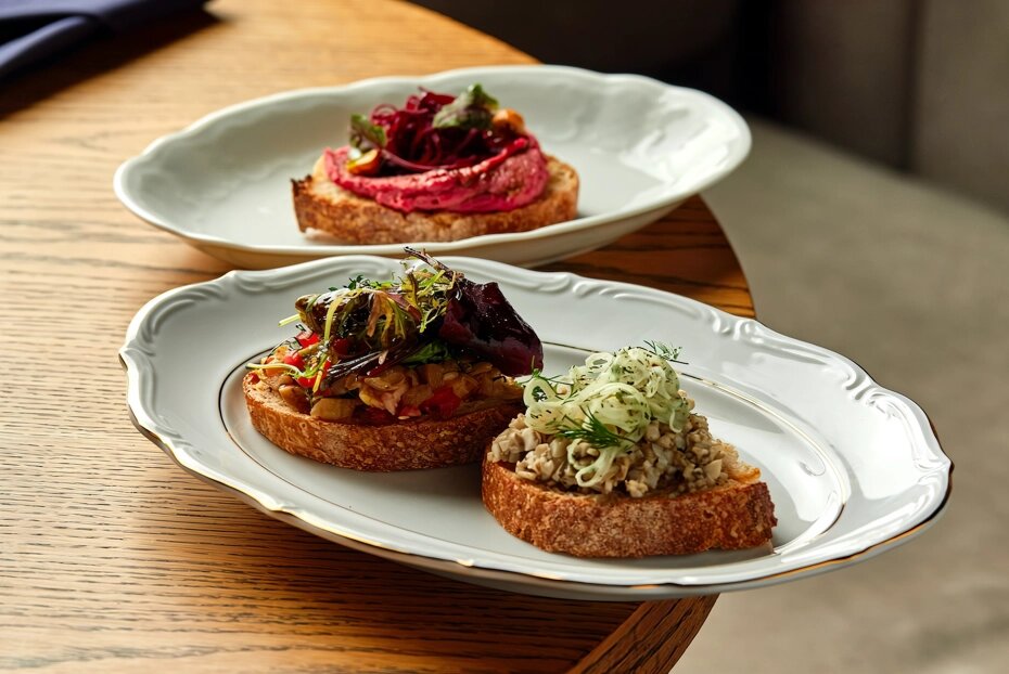 Бутерброды с баклажановой икрой, свекольным муссом и грибной икрой