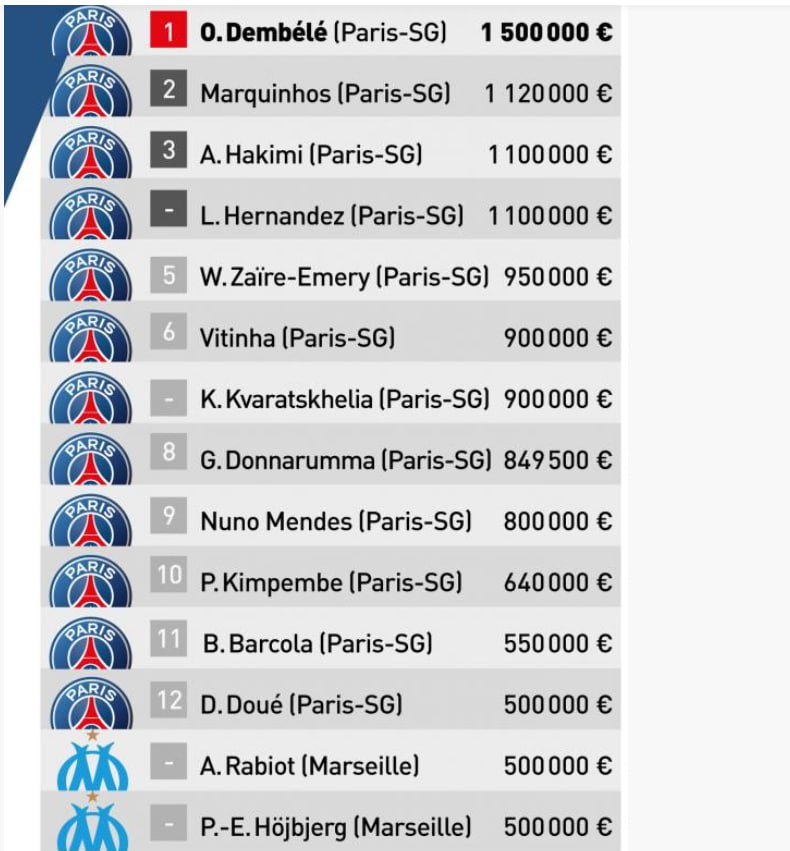 Самым высокооплачиваемым игроком Лиги 1 стал Усман Дембеле − 1,5 млн евро в месяц. Далее идут Маркиньос − 1,12 млн евро и Ашраф Хакими с Люкой Эрнандесом − по 1,1 млн евро. Двенадцать первых мест в списке заняли только игроки «ПСЖ», причем после подписания нового контракта вундеркинд парижан Уоррен Заир-Эмери может похвастаться солидной зарплатой − 950 тысяч евро в месяц, пятое место.