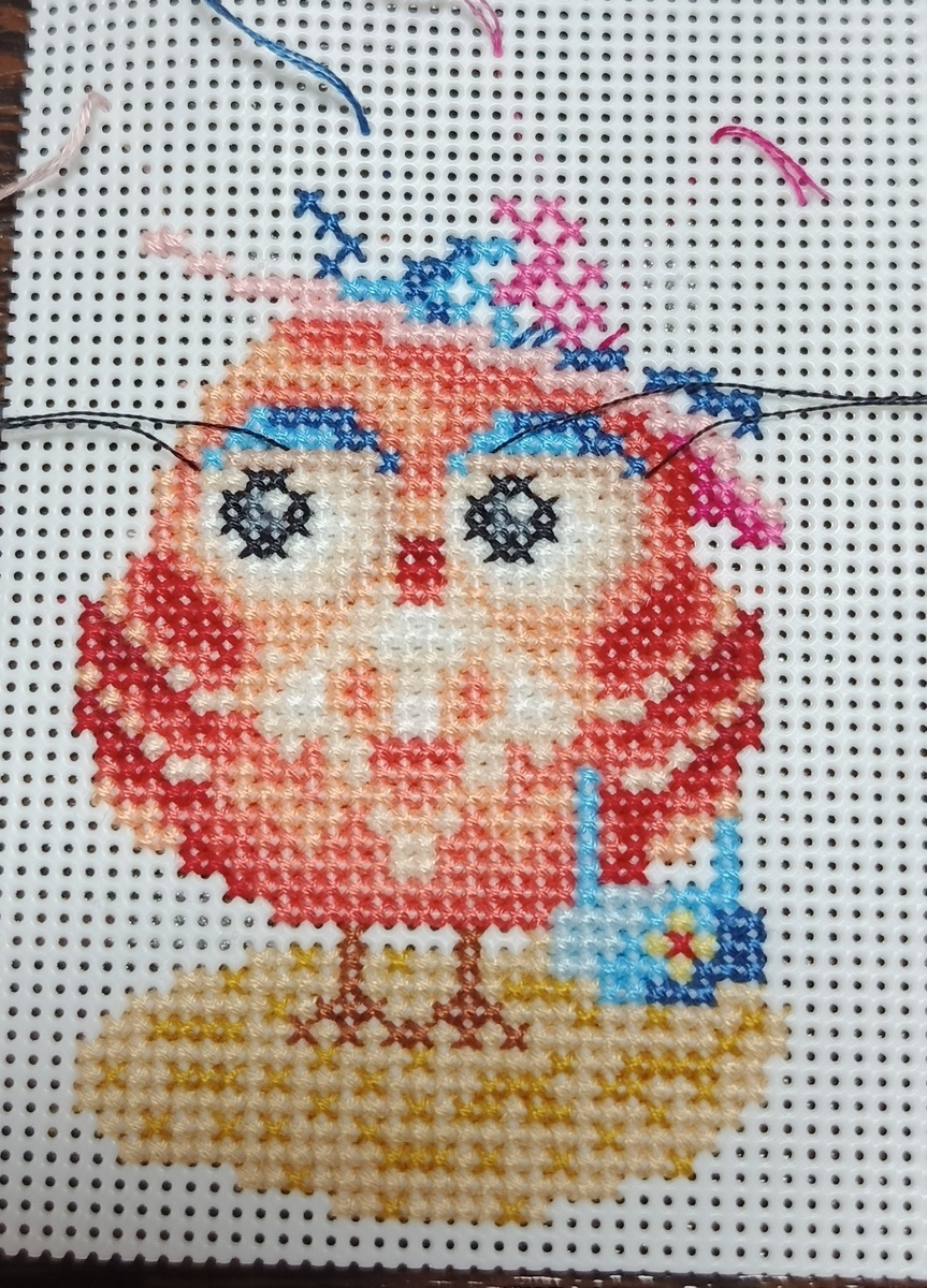 У совушки вышился лоб и приростает шляпка😋, еще один вечерок и все крестики будут готовы, можно будет приступить к многочисленному бекстичу😏