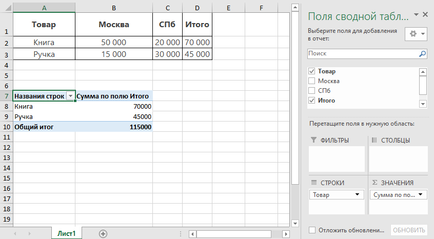 Покажите только товары с продажами выше 40 000. Если исходные данные изменились: Важно: Если вы добавили новые строки, расширьте исходный диапазон (клик правой кнопкой → «Изменить источник данных»). | Дата | Категория | Город | Доход |