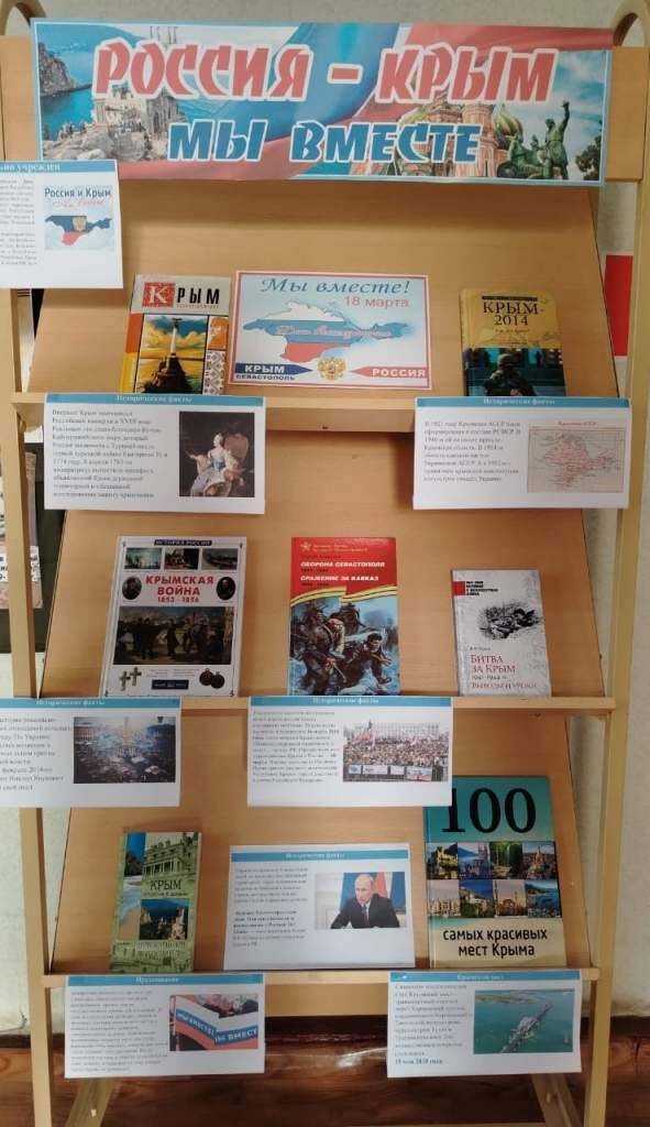 В детской библиотеке оформлен стенд «Россия – Крым: мы вместе». Книги, представленные на нем, адресованы широкой аудитории, интересующейся историей Крыма, его прошлым и настоящим. Посетители библиотеки могут узнать о географическом расположении полуострова, о том, как Крым вошел в состав Украины, о конфликте в 2013-2014 годов и воссоединении Крыма с Россией.