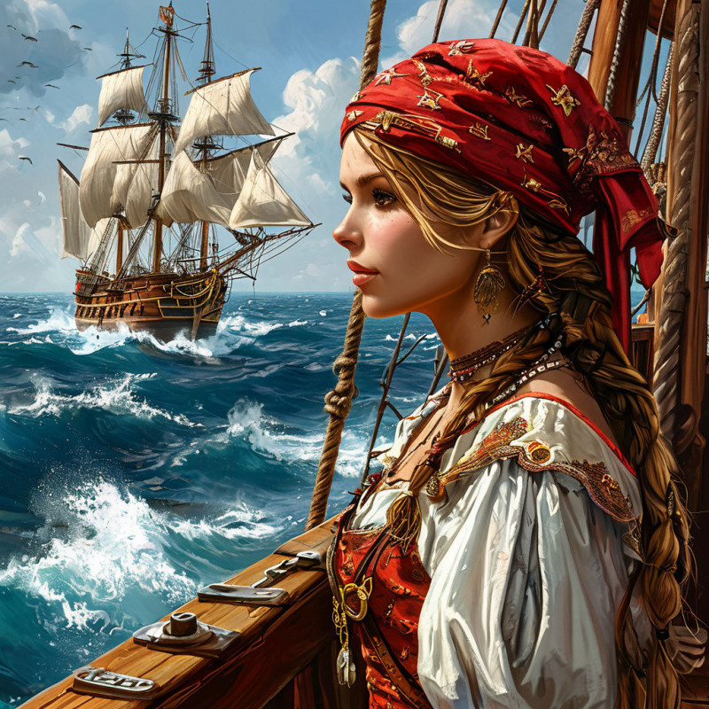 На палубе шла подготовка к бою. Мушкетеры на баке строились в линию. Рядом с ними уже был ее муж. Команде раздавали сабли и кортики из открытой оружейной. По вантам сновали матросы. Корабль шел под всеми парусами. Были поставлены даже косые паруса, которые, как она уже знала, ставили только, когда корабль шел против ветра. Над палубой уже были натянуты сети от падающих обломков. На мостике стояли офицеры и ее муж, всматривались вдаль. Клубы дыма от предыдущего залпа уже рассеивались и уже даже невооруженным взглядом была видна причина всей суеты – нагоняющий их фрегат. Флагов поднято не было, а значило это только одно – пираты. Орудия на носу фрегата вспухли дымными облачками и прямо перед носом галеона встали два высоки фонтана – сигнал остановится.