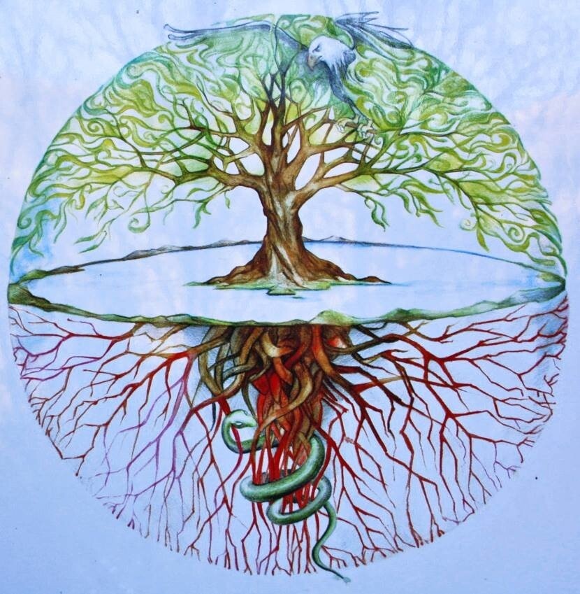 И вот, мы уже научились опускать Небеса на землю вокруг себя на поляну. И тут, к нам приходит озарение, что глазами личности мы видим только формы... Всматриваемся вокруг Душой и понимаем, что видим лишь половину деревьев над землёй. Внизу у каждого дерева скрытая сеть невидимых корней, и они растут вниз, в отличие от макушки. При этом всё дерево целиком насыщается одной и той же Световой Небесной Энергией - значит Световая Энергия проникает и под землю тоже...