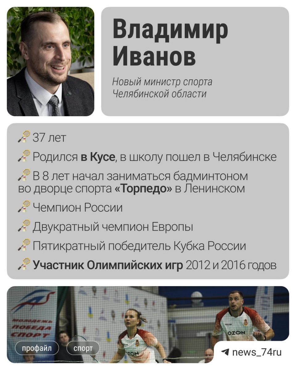 «Тренер может и должен подрабатывать» В феврале Министерство спорта Челябинской области возглавил 37-летний чемпион Европы по бадминтону Владимир Иванов, продолжающий выступать на профессиональной арене. Некоторые южноуральцы скептически отнеслись к решению поставить на эту должность человека без управленческого опыта, но сам Владимир Иванов считает, что проблемы спортсменов понять может только тот, кто сам живет спортом и знает систему изнутри. О том, как планирует привлекать деньги на развитие спорта, о зарплатах и не только, в интервью с новым министром спорта Владимиром Ивановым. Здесь лишь маленькие фрагменты большого разговора о региональном спорте. Полный текст ждет вас на сайте → Губернатор поставил вам задачу довести до 70% число людей, которые регулярно занимаются спортом (сейчас это 65%). Что это за цифра, откуда она? 🔚 Это по формуле всё рассчитывается, все расчеты происходят автоматически. Если говорить максимально просто, то это доля общего количества занимающихся фи