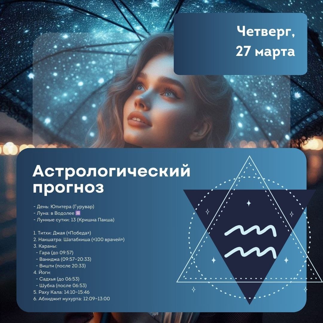 Астрологический прогноз на 27 марта 2025 (четверг) в системе Джйотиш 🌟 День Юпитера (Гурувар) | Луна в Водолее ♒️ | 13-е лунные сутки (Кришна Пакша) 🗝Ключевые астрологические факторы: 1. Титхи Джая («Победа»): - Управитель Юпитер — усиливает мудрость, справедливость. - Рекомендуется: Начинать судебные процессы, образовательные проекты, давать обеты. 2. Накшатра Шатабхиша («100 врачей»): ➕ - Управитель Раху — энергия исцеления, тайн, инноваций. - Фокус: Научные исследования, цифровые технологии, детоксикация организма. - Осторожно: Избегайте скрытности в общении — Раху может спровоцировать недопонимание. 3. Караны: - Гара (до 09:57): Посадка растений, ремонт, работа с землёй. - Ваниджа (09:57–20:33): Торговля, переговоры, искусство. - Вишти (после 20:33): Запрещены старты. 4. Йоги: - Садхья (до 06:53): Гармоничные отношения, творчество. - Шубха (после 06:53): Успех в публичных выступлениях, карьерных вопросах. 5. Раху Кала (14:10
