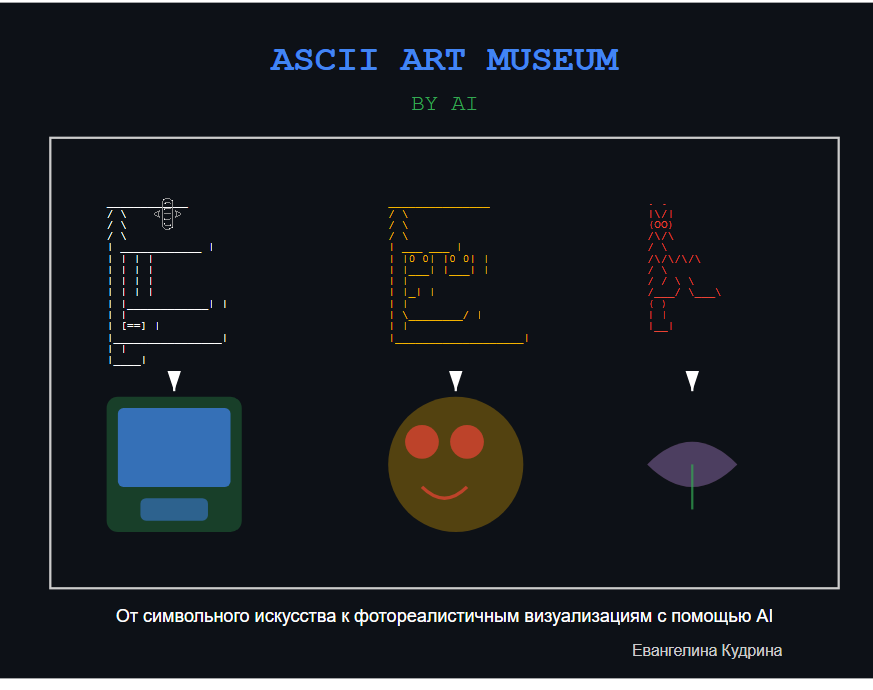 Проект «ASCII ART MUSEUM BY AI» от студентки Школы дизайна НИУ ВШЭ Евангелины Кудриной представляет собой инновационное переосмысление ретро-эстетики текстового искусства через призму современных технологий искусственного интеллекта. Концептуальный виртуальный музей объединяет историческое наследие ASCII-арта с возможностями нейросетевой генерации изображений. ASCII-арт, зародившийся в 60-е годы прошлого века вместе с появлением универсального кода для передачи данных, получает новое прочтение благодаря искусственному интеллекту. Проект исследует эволюцию текстового искусства от простых символьных композиций до сложных визуальных концепций, демонстрируя, как компьютерная эстетика раннего цифрового периода взаимодействует с передовыми AI-технологиями. В основе проекта лежит использование нейросети Recraft AI для создания виртуального пространства музея. Автор демонстрирует процесс трансформации концепции текстового искусства в фотореалистичные визуализации выставочного пространства.