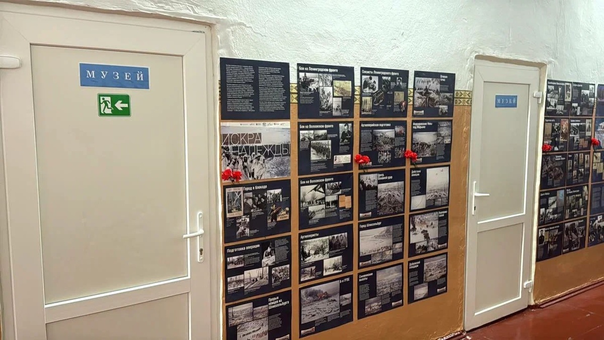 Экспозиция начинается с тематического баннера, установленного в холле. Далее ученики могут ознакомиться с плакатами, которые размещаются на стенах одного из коридоров. Они разделены по трем разделам: «Ледяная петля», «Багровый рубеж» и «Искра надежды». Педагоги будут проводить для учеников экскурсии по музею, рассказывая о событиях войны.