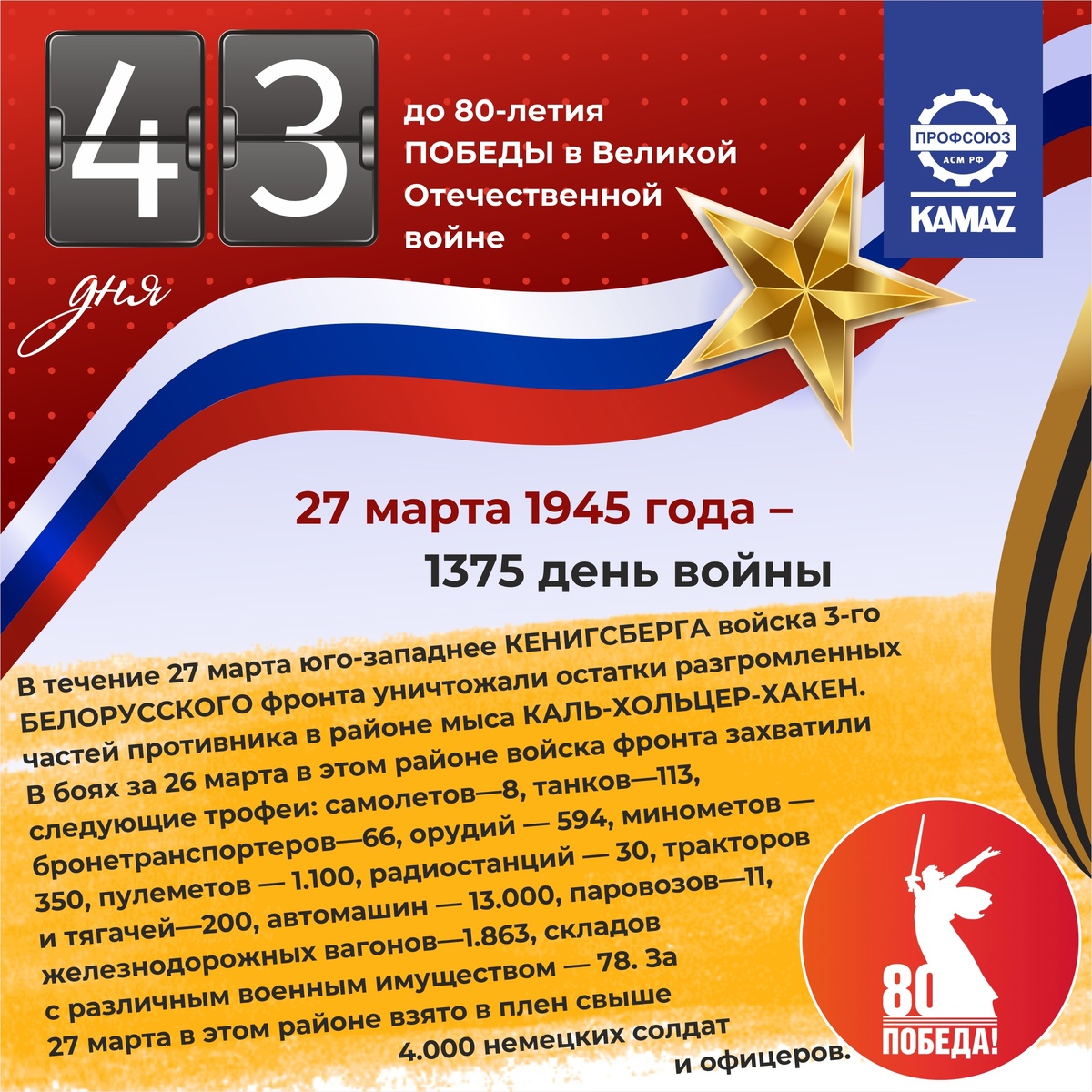 В течение 27 марта юго-западнее КЕНИГСБЕРГА войска 3-го БЕЛОРУССКОГО фронта уничтожали остатки разгромленных частей противника в районе мыса КАЛЬ-ХОЛЬЦЕР-ХАКЕН, заняв при этом населенные пункты ВОЛИТТНИКК, ШНЕКЕН-БЕРГ, ФОЛЛЕНДОРФ, ЛИНДЕНБЕРГ. В боях за 26 марта в этом районе войска фронта захватили следующие трофеи: самолетов—8, танков—113, бронетранспортеров—66, орудий — 594, минометов — 350, пулеметов — 1.100, радиостанций — 30, тракторов и тягачей—200, автомашин — 13.000, паровозов—11, железнодорожных вагонов—1.863, складов с различным военным имуществом — 78. За 27 марта в этом районе взято в плен свыше 4.000 немецких солдат и офицеров.