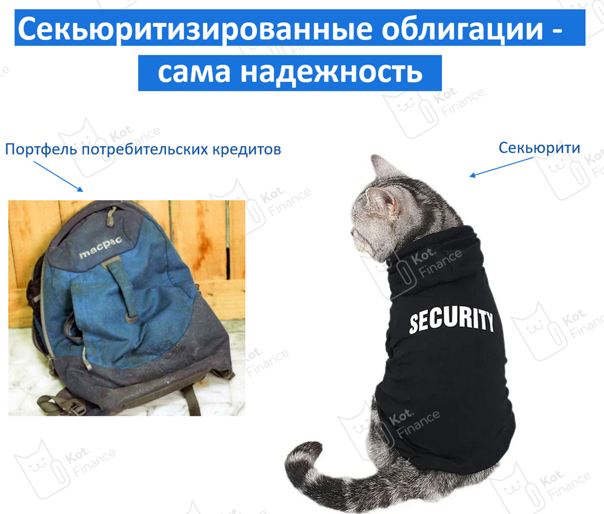-- Секьюритизация – это упаковка однородных активов (ПОС, или портфель однородных ссуд) в портфель для продажи инвесторам. Секьюритизированные выпуски – это способ банков привлечь новые деньги, не увеличивая собственную долговую нагрузку: 1. Банк выдает потребительские кредиты под 30% годовых. С учетом резервов, это «давит» на капитал и не позволяет выдавать больше кредитов 2. Банк формирует из тысяч однородных непросроченных кредитов портфель и продает как СФО (специализированное финансовое общество). После продажи банк не отвечает по обязательствам перед СФО. 3. Инвестор, купивший СФО получает доходность, например, 25% годовых (ведь банк часть маржи оставил себе, иначе смысл?). Банк получил деньги, списал кредиты с баланса и может выдавать новые + облигации обеспечены денежным потоком по огромному количеству кредитов + фантастическая диверсификация. Зачастую в один пул упаковывают сотни тысяч кр