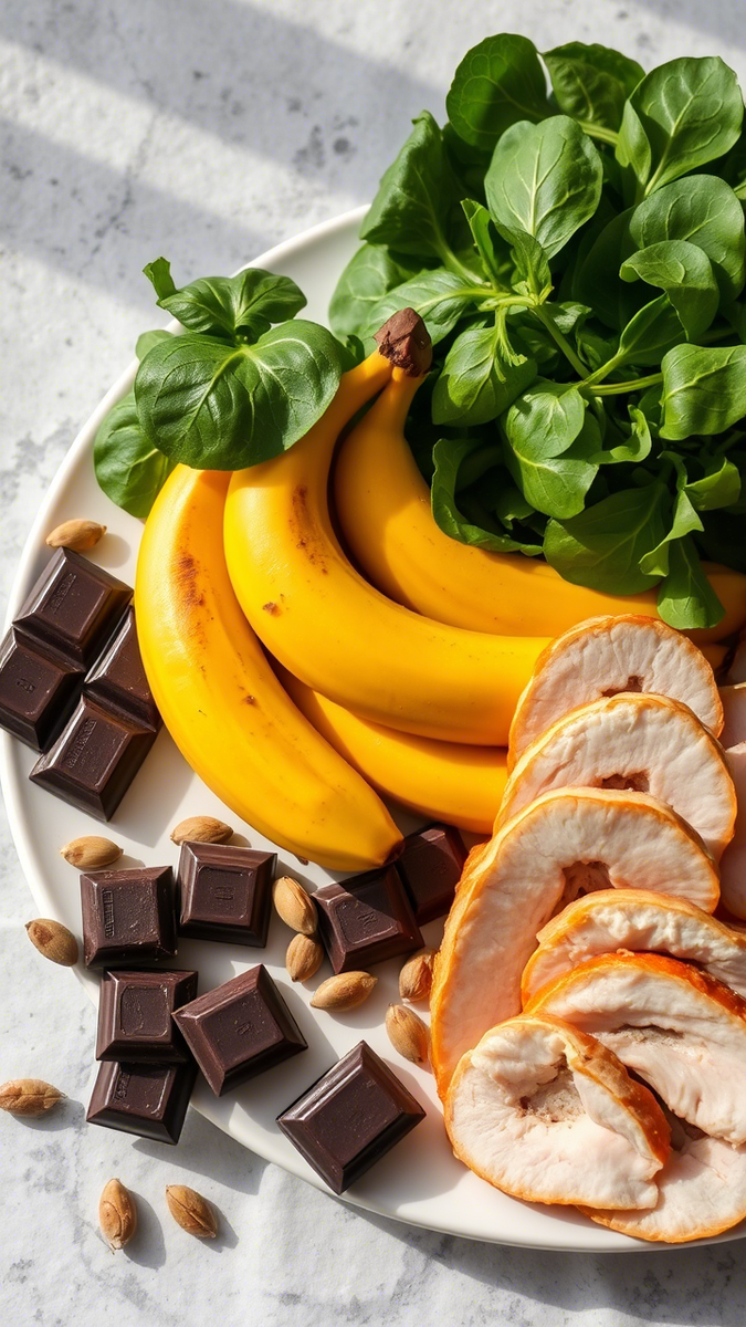У всех бывают дни когда тянет на шоколад и чипсы? Организм ищет магний и триптофан! Но вместо таблеток и вредных перекусов выберите 5 натуральных продуктов, которые снимут раздражительность, уберут отёки и вернут спокойствие. Диетологи подтверждают: это работает! Топ-5 продуктов: 1. Тёмный шоколад (70%+): - Почему: Магний (230 мг/100 г) → снижает тревожность и спазмы (Journal of Women’s Health). - Доза: 20 г в день → без вреда для фигуры. 2. Бананы: - Почему: Калий (358 мг/шт) → борется с отёками + витамин В6 → улучшает настроение. - Рецепт: Банановый смузи с овсянкой → сытость на 3 часа. 3. Тыквенные семечки: - Почему: Цинк (7.5 мг/100 г) → регулирует гормональный баланс. - Лайфхак: Поджарьте с корицей → полезный перекус. 4. Шпинат: - Почему: Железо + фолиевая кислота → профилактика слабости и головокружений. - Рецепт: Салат с шпинатом, яйцом и кунжутом → готовится за 10 минут. 5. Индейка: - Почему: Триптофан → превращается