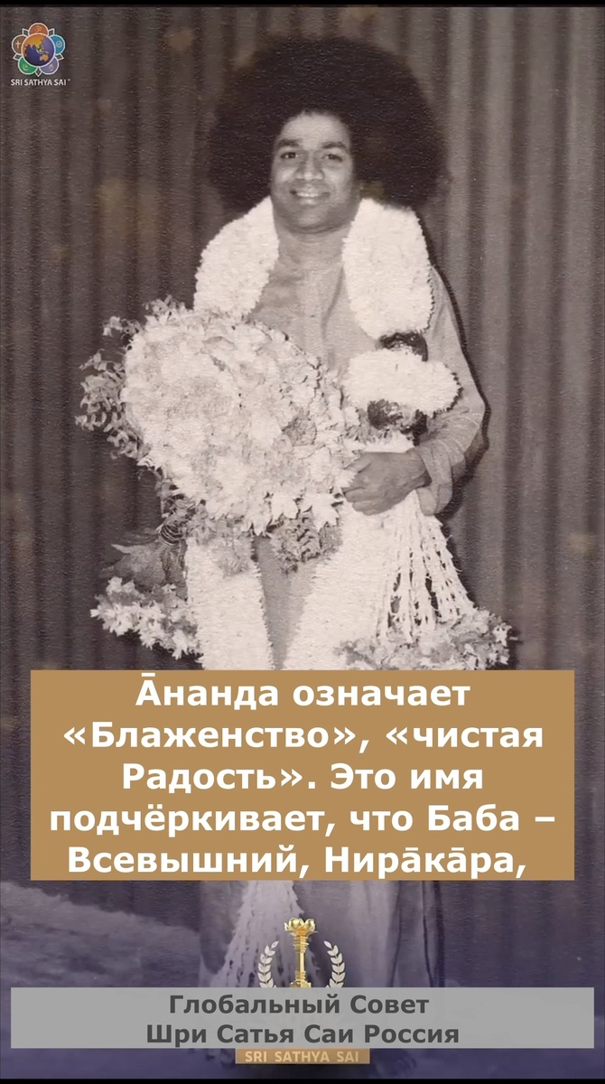 108 имён Шри Сатья Саи Бабы К 100-летию Бхагавана мы продолжаем воспевать 108 имён Шри Сатья Саи Бабы! 36. Ом Шрӣ Сāи Āнандāйа Намаха Āнанда означает «Блаженство», «чистая Радость». Это имя подчёркивает, что Баба – Всевышний, Нирāкāра, явившийся в человеческой форме. Шанкарачарья сказал: «Этот Брахман – Блаженство, от которого, как нам кажется, мы отделены вследствие упадхи, как капли воды от океана, и когда мы достигаем единства, это и есть Брахман»; Баба – Брахман, ибо «Брахмавид Брахмаива Бхавати». Знающий Брахмана воистину становится Брахманом». Он – «Парамананда-сварӯпа». Саи, пребывающий в человеке, и Саи, пребывающий в Солнце – «Са Экаха» – Он Один. «В каком бы существе ни присутствовало Блаженство – в человеке ли, в других живых существах, в дэвах или космических созданиях – каким бы ни было средство передвижения или упадхи, всё Блаженство едино. Все существа живут на малой части Неизмеримого Блаженства», – так сказано в Ведах. Āнанда, которую мы получаем, ко