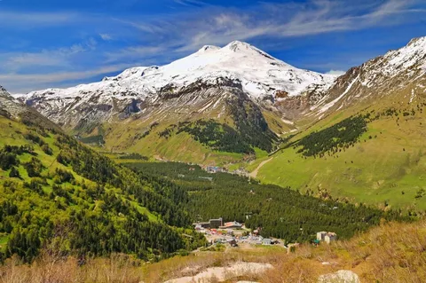 Приэльбрусье — это высокогорная долина у подножия Эльбруса (5642 м), где в мае дневная температура достигает +15–20 °C, а ночью опускается до 0 °C. Снег в высокогорье сохраняется до июня, что создаёт уникальные условия для лыжного спорта и альпинизма.