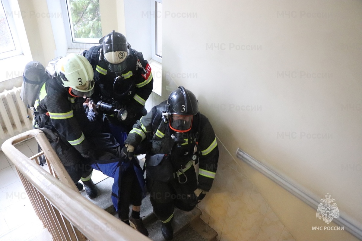 Личным составом подразделений пожарной охраны были определены направления и маршруты ведения спасательных работ из здания, проверена возможность беспрепятственного доступа ко всем помещениям, отработаны схемы подачи огнетушащих веществ, вопросы взаимодействия пожарных подразделений с руководством учреждения, службами жизнеобеспечения города при проведении аварийно-спасательных работ