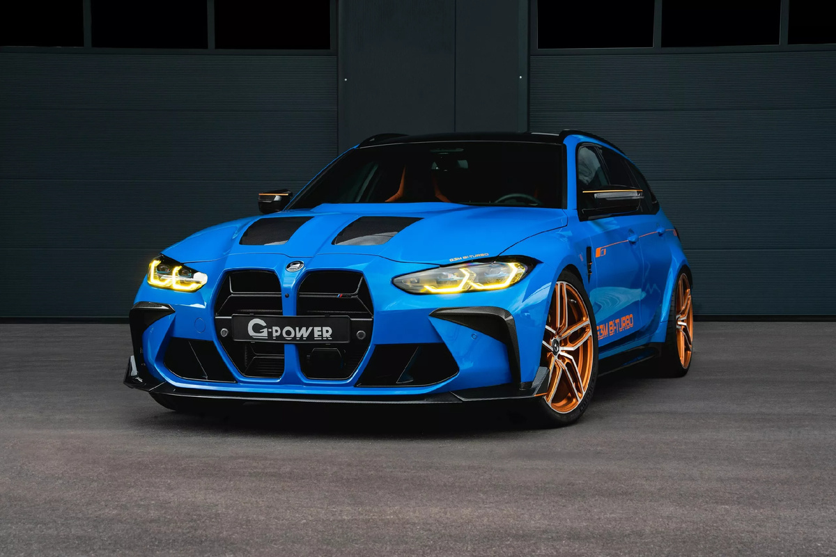 BMW M3 Touring и так не был тихим семейным универсалом, но тюнеры из G-Power решили, что никаких компромиссов тут быть не может. Так появился G3M Bi-Turbo — монстр на колесах, который легко улетает в закат, разгоняясь до 330 км/ч. В основе доработок лежит стандартный 3 л шестицилиндровый мотор S58 с двумя турбинами. Заводская версия в спецификации Competition выдает 510 л.с. и 650 Нм, но инженеры G-Power посчитали, что это смешные цифры. Поэтому штатные турбины отправились в утиль, на их место поставили более крупные агрегаты, а заодно заменили выпуск на новый, с 200-ячеечными катализаторами. Итог — 789 л.с. и 900 Нм момента. Пока держат в секрете, но очевидно, что такой универсал легко уедет от большинства соперников. А вот максимальная скорость известна — 330 км/ч. Это уровень Ferrari и McLaren, но с багажником и удобными задними сиденьями. Внешне G3M Bi-Turbo тоже выделяется на фоне потока. Капот из карбона с огромным воздухозаборником, новый передний сплиттер, карбоновые зеркала,