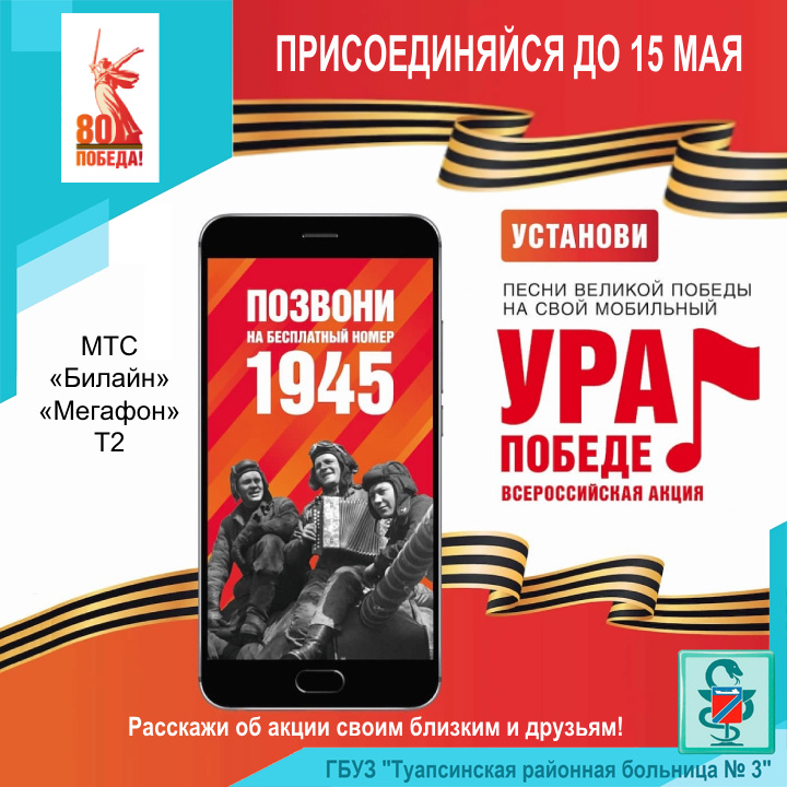 АКЦИЯ «УРА ПОБЕДЕ!» В год 80-летия Победы в Великой Отечественной войне проводится акция «Ура Победе!». Она проводится с 25 февраля по 15 мая 2025 года и адресована всем, кому дорога память о наших героях, кто хочет отдать дань уважения ветеранам, поддержать всенародный праздник. Чтобы принять участие в акции «Ура Победе!», наберите бесплатный короткий номер 1945. Здесь Вы можете прослушать ежедневные сводки Совинформбюро, зачитанные Юрием Левитаном, установить вместо гудков входящего вызова или в качестве мелодии звонка популярные песни «Тёмная ночь», «Катюша», «Прощание славянки», «Синий платочек», «Нам нужна одна Победа», а также получить ссылку для загрузки логотипа юбилея Победы. Присоединяйтесь к акции «Ура Победе!» и расскажите о ней своим близким и друзьям! #УраПобеде!