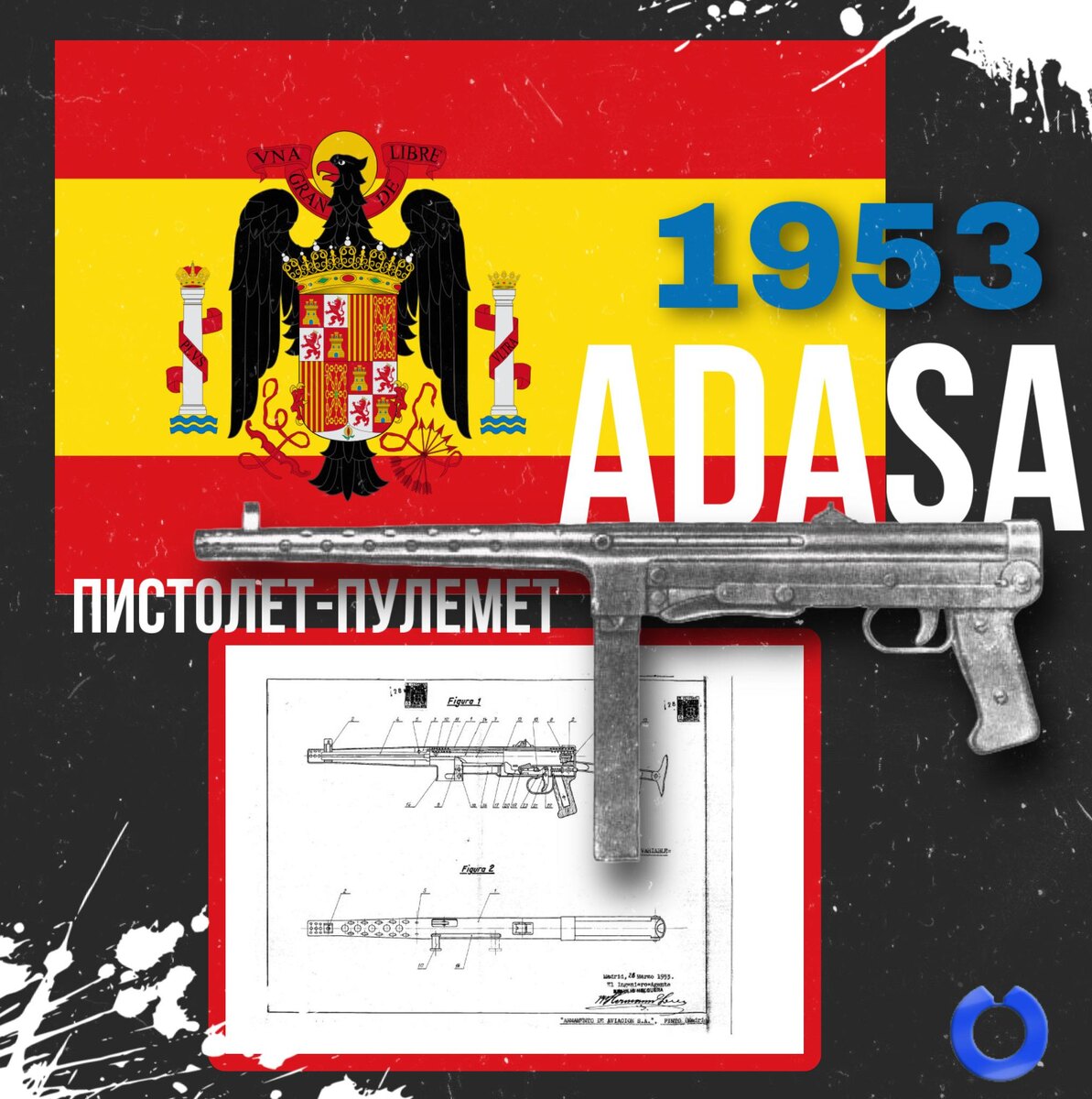 В начале 50-х годов Испания решила создать собственный пистолет-пулемёт, который мог бы использоваться ВВС и другими военными подразделениями. Так появился ADASA Modelo 1953, разработанный Людвигом Форгримлером и выпущенный на мадридской фабрике Armamento de Aviación S.A. ADASA Modelo 1953 имел свободный затвор и вел огонь с открытого затвора, а его конструкция активно использовала штамповку и сварку, что упрощало производство. Использование STEN: Спусковой механизм был переработан на основе британского STEN, но основную пружину заменили на две торсионные пружины. Влияние советского оружия: В конструкции прослеживаются элементы ППС-43 и его испанской копии DUX. Магазин от MP 38/MP 40: ADASA получил конструктивно схожий магазин, что упрощало снабжение. Несмотря на интересные решения, пистолет-пулемёт не получил массового производства. Однако он стал одним из первых испанских шагов в создании автоматического оружия.