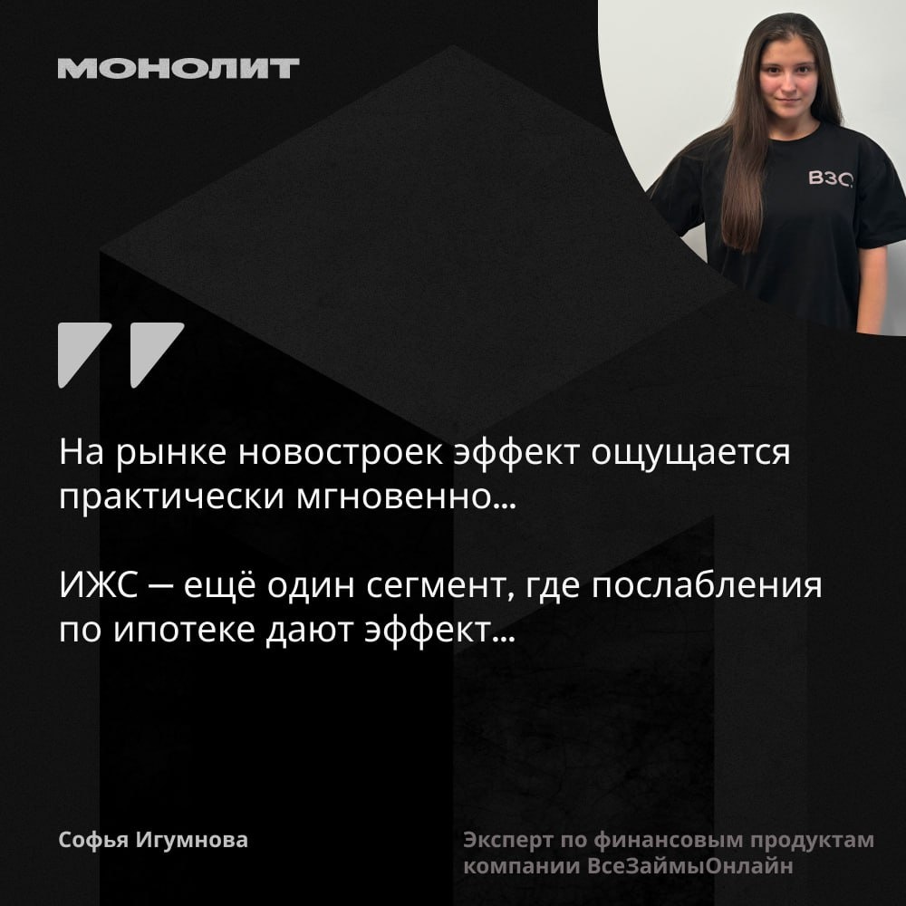 Как отразилось снижение первоначального взноса по ипотеке на рынок? 🗣Мнение эксперта по финансовым продуктам компании "ВсеЗаймыОнлайн" Софьи Игумновой: 👉На рынке новостроек эффект ощущается практически мгновенно. Понижение ставок делает ипотеку доступнее, особенно в сегменте эконом- и комфорт-класса. По данным ЦИАН, доля ипотечных сделок в новостройках в 2024 году составляла около 68%, но после отмены льготной ипотеки летом показатель снизился до менее чем 50% к декабрю. При этом спрос оживился в конце года за счёт субсидированных программ от застройщиков, а в январе 2025-го пошёл обратный откат. Это говорит о том, насколько чутко рынок реагирует на изменения в ипотечном кредитовании. Если меры по снижению ставок и взносов сохранятся, мы снова увидим рост продаж и цен — особенно в городах с дефицитом предложения. 👉ИЖС — ещё один сегмент, где послабления по ипотеке дают эффект. Всё больше семей рассматривают загородное строительство как реальную альтернативу покупке квартиры. Это