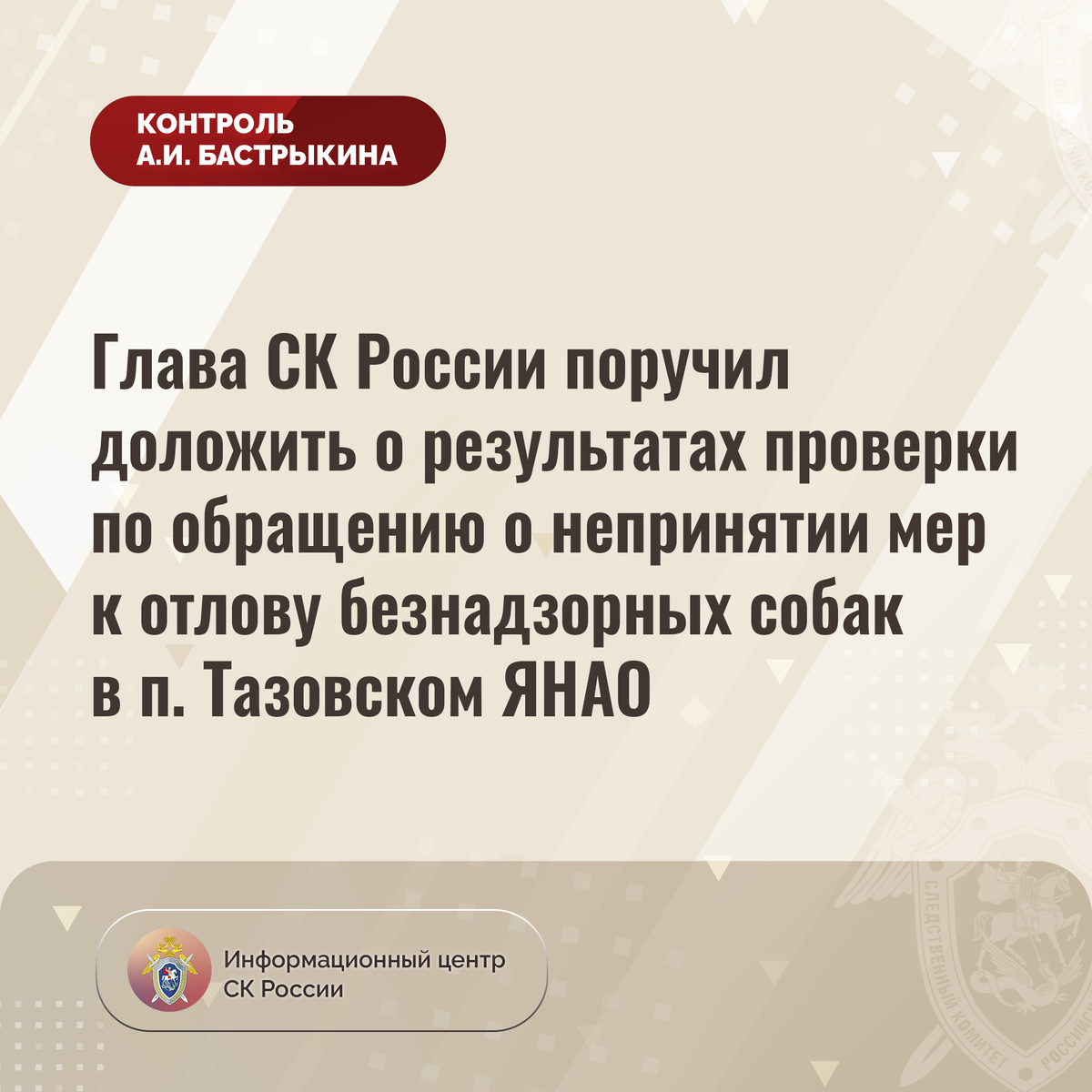 Глава СК России поручил доложить о результатах проверки по обращению о непринятии мер к отлову безнадзорных собак в п. Тазовском Ямало-Ненецкого автономного округа В Информационный центр СК России обратилась жительница Ямало-Ненецкого автономного округа. Она сообщила, что в поселке Тазовском на протяжении длительного времени обитает стая агрессивных собак, которая в феврале текущего года напала на ее восьмилетнего сына, возвращавшегося из школы. Травм удалось избежать, однако мальчик до настоящего времени опасается покидать место жительства. Несмотря на многочисленные обращения, мер к разрешению проблемы не принимается. В СУ СК России по Ямало-Ненецкому автономному округу по поступившему обращению начата процессуальная проверка. Председатель Следственного комитета Российской Федерации Александр Иванович Бастрыкин поручил руководителю СУ СК России по Ямало-Ненецкому автономному округу Андрею Николаевичу Егорову представить доклад о ходе и результатах процессуальной проверки, поставив е
