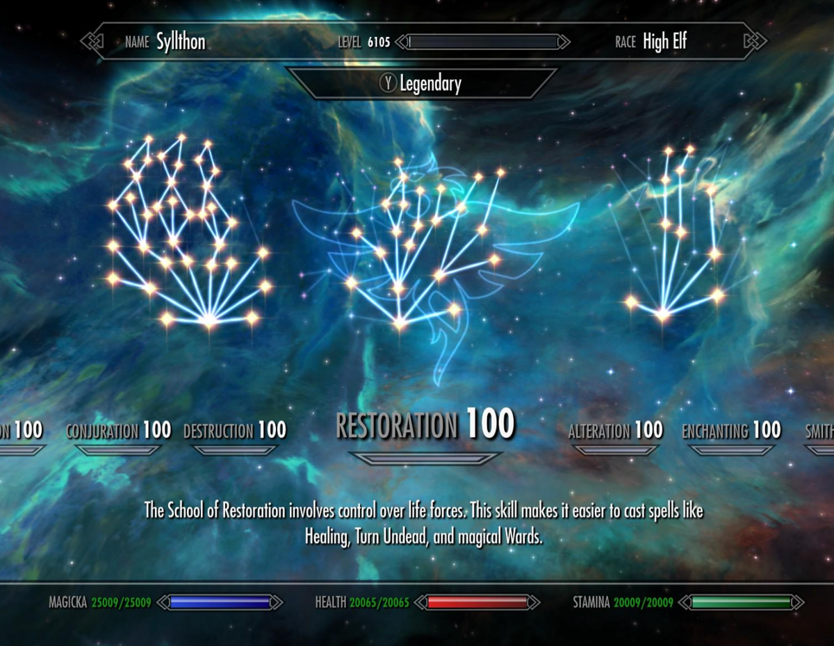 Однако, просто удалить этого персонажа не смог. 6105 уровень это сильно. Но на скриншоте видно, что его дерево развития навыков отличается от оригинальной версии Скайрима.