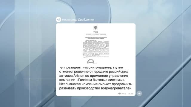 Владимир Путин отменил решение о передаче российских активов Ariston во временное управление