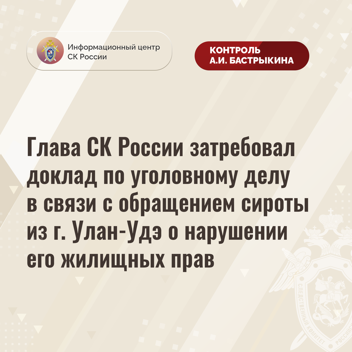 Глава СК России затребовал доклад по уголовному делу в связи с обращением сироты из г. Улан-Удэ о нарушении его жилищных прав В Информационный центр СК России обратился сирота из города Улан-Удэ Республики Бурятии по вопросу неполучения положенного по закону жилья. Мужчина, имеющий на иждивении четверых несовершеннолетних детей, трое из которых являются инвалидами, длительное время состоит в специализированной очереди. Несмотря на многочисленные обращения в различные инстанции, мер к реализации его прав не принимается. В СУ СК России по Республике Бурятии расследуется уголовное дело. В ходе следствия будут рассмотрены озвученные в обращении доводы. Председатель Следственного комитета Российской Федерации Александр Иванович Бастрыкин затребовал у руководителя СУ СК России по Республике Бурятии Евгения Вячеславовича Лагацкого доклад о ходе и результатах расследования уголовного дела. Исполнение поручения поставлено на контроль в центральном аппарате ведомства. #СледственныйКомитет #СКР
