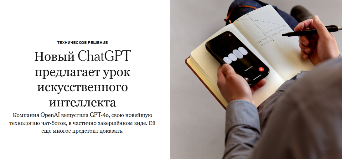 К моему огорчению, демонстрация оказалась, по сути, обманом. Новый ChatGPT был выпущен без большинства новых функций, включая улучшенный голос (который, как мне сказали в компании, был отложен для внесения исправлений). Также пока недоступна возможность использовать видеокамеру телефона для анализа чего-то вроде математической задачи в реальном времени.