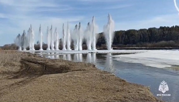 На реке Ай вблизи села Месягутово Дуванского района военные произвели подрывы льда. Толщина ледового покрытия там достигала 70-80 сантиметров, информирует МЧС региона. Лед находился без движения и создавал возможную угрозу скопления мусора и ледяных масс. Сейчас сотрудники ведомства проводят мониторинг данного участка реки. Фото: скриншот видео МЧС РБ.