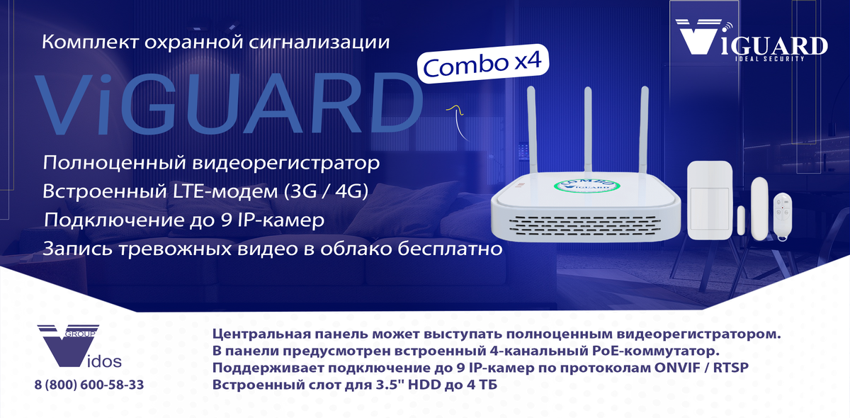 Радиоканальная система ViGUARD COMBOx4 – это беспроводная охранная сигнализация для квартир, частных домов, небольших и средних коммерческих объектов, где требуется удобная и функциональная система безопасности. 🔥 Беспроводная сигнализация Стартовый комплект COMBOx4 состоит из хаба, внутреннего PIR-датчика движения, СМК-датчика открытия окна/двери и пульта ДУ. В линейку COMBOx4 также входят различные сенсоры и элементы управления, которые позволяют создать безопасное и умное автоматизированное пространство: датчики дыма, бытового газа, протечки воды, температуры и влажности, тревожные кнопки, звуковые сирены, слаботочное реле, управляемая розетка. 📎 Всего на одну панель можно завести до 64 датчиков (зон), которые можно распределить между 8 разделами (помещениями/зданиями), каждым из которых можно отдельно управлять в мобильном приложении или через web/HDMI-интерфейс. Там же можно настроить сценарий, добавить новый датчик, поделиться системой с другим пользователем, вести контроль жур