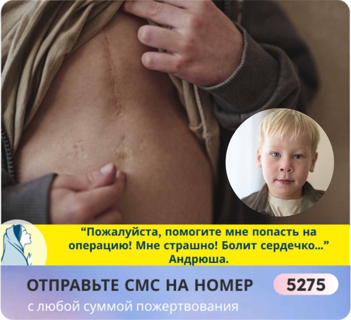 То, что сбор остановился на середине, может обернуться трагедией и остановить жизнь малыша! Пожалуйста, проявите милосердие! Андрей с самого появления на свет прошёл все муки, какие только можно было представить! На груди у него остался жуткий шрам после операций. На 5 сутки жизни Андрюше сделали операцию Рашкинда и поставили сердечный стент. Неделю он провёл в реанимации, борясь за жизнь. В 4 месяца доктора провели операцию Норвуда-Глена, но вскоре затромбировалась левая полая вена в сердце. Андрюша выживал в реанимации из последних хрупких сил, его очень долго не решались снять с ИВЛ. Восстановление для малыша было очень мучительным и рискованным! В сердечке бедного мальчика едва теплилась жизнь!