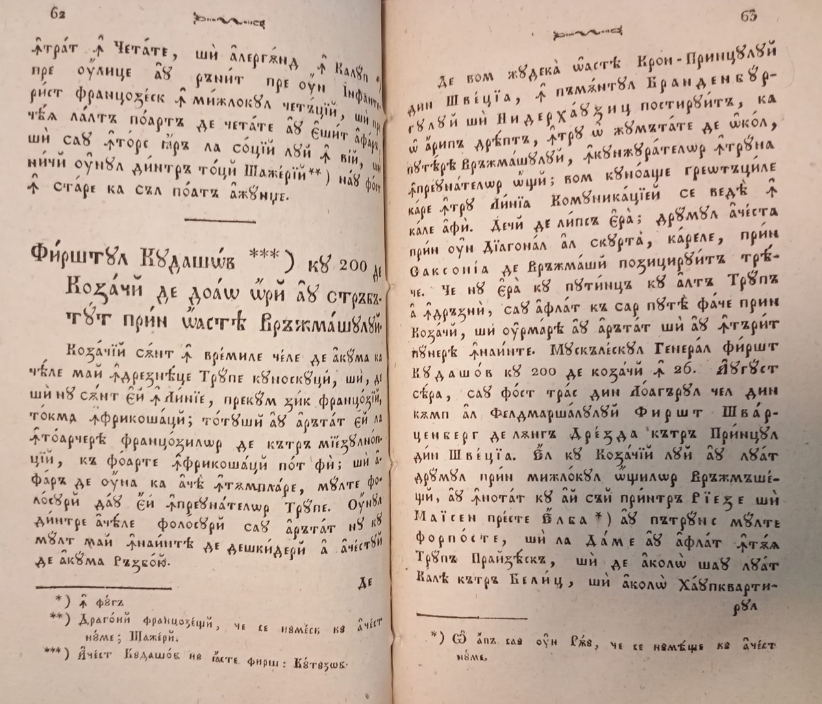 întrat în Cetate, și alergând în Kalup *) pre ulițe au rănit pre un infanterist franțozesc în mijlocul cetății, și pre ceea laltă poartă de cetate au ieșit afară, și s-au întors iară la soții lui în vii, și nici unul dintre toți Șajerii**) nau fost în stare ca săl poată ajunge. _____________ Cozacii sânt în vremile cel de acuma ca cele mai îndrăznețe Trupe cunoscuți, și. de și nu sânt ei în linie, precum zic franțozii, tocma înfricoșați; totuși au arătat ei la întoarcerea franțozilor de cătră miezul nopții, că foarte înfricoșați pot fi; și afară de una ca acea întâmplare, multe folosuri dau ei înpreunatelor Trupe. Unul dintre acele folosuri sau arătat nu cu mult mai înainte de deșchideri a acestui de acuma Războiu. ______________________ *) în fugă **) Dragonii franțozești, ce se numesc cu acest nume; Șajeri ***)Acest Kudașov nu iaste firșt: Kutuzov De vom judeca oastea Kron-Prințului din Șveția, în pământul Brandenburgului și Niderhauziț postiruită, ca o aripă dreaptă, întru o jumătat