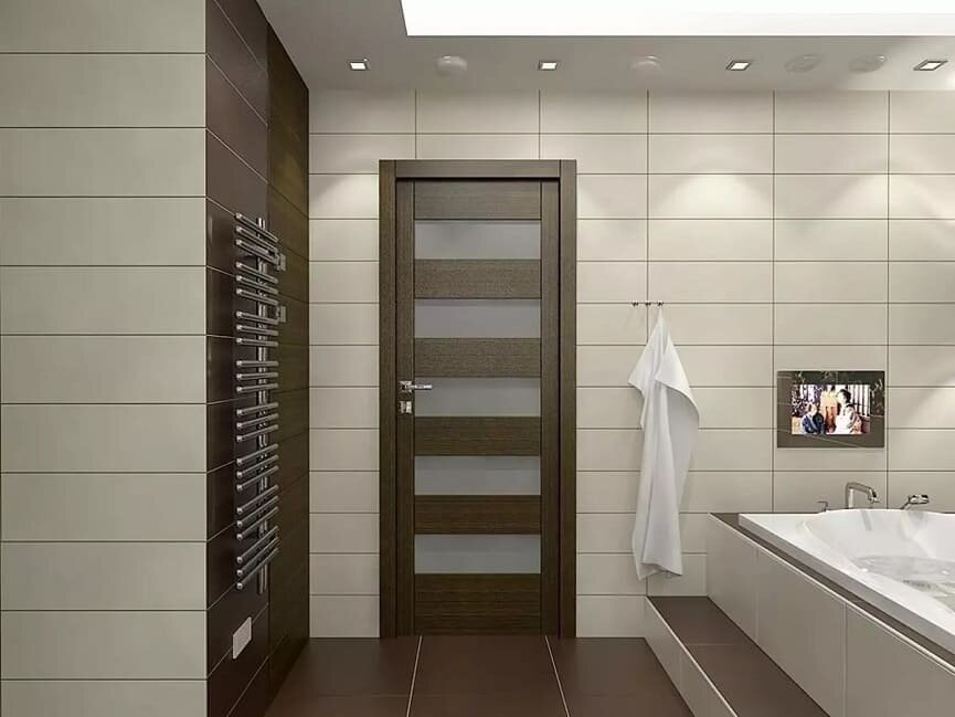Лучшее решение — двери с покрытием из ПВХ, экошпона или эмали. Они не боятся влаги, выглядят аккуратно и служат годами.