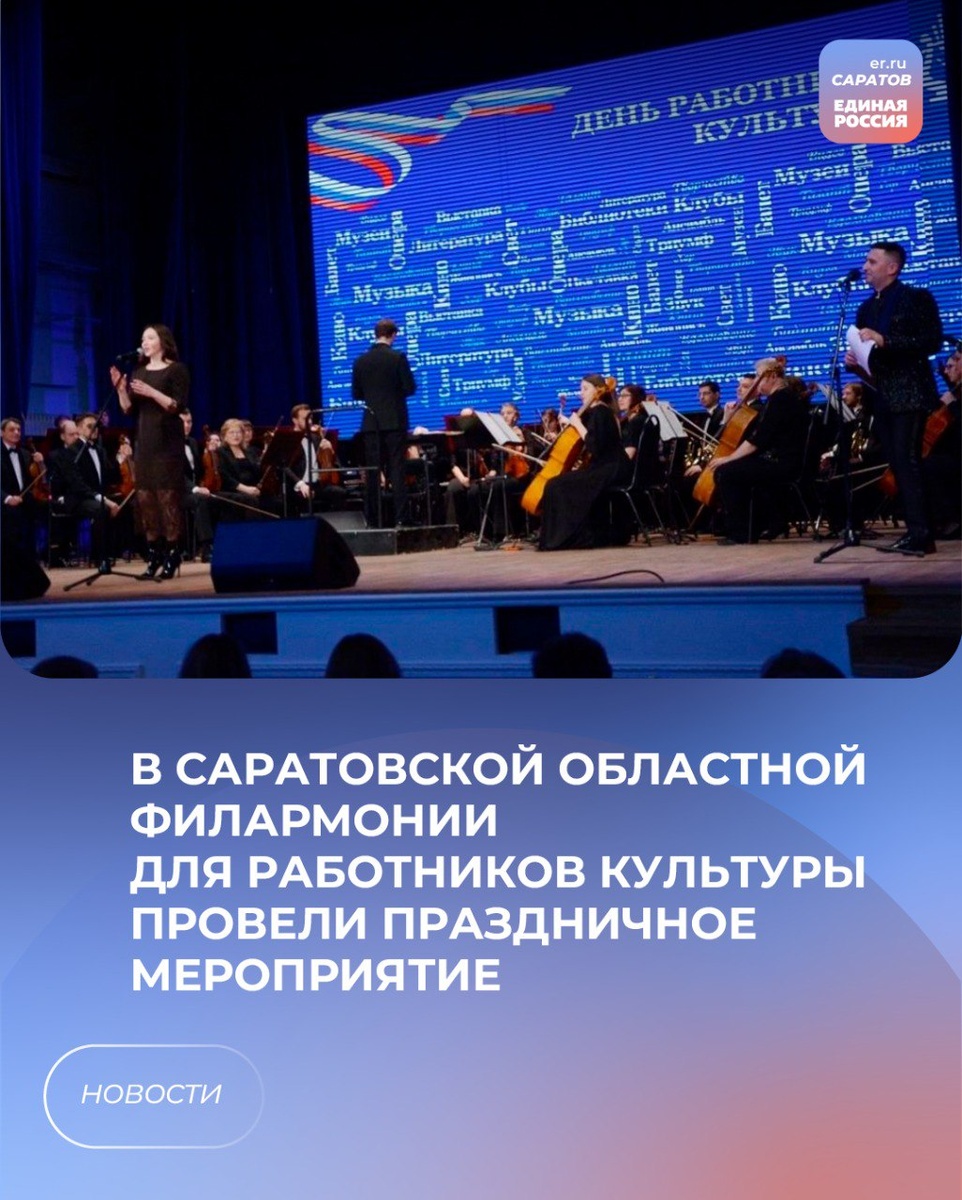 🎭В торжественной обстановке наградили активистов федерального проекта «Культура малой Родины» партии «Единая Россия». В преддверии профессионального праздника в зале Саратовской областной филармонии имени А. Г. Шнитке состоялось мероприятие, в котором приняли участие активисты партийного проекта «Культура малой Родины». В рамках мероприятия благодарственные письма за большой вклад в развитие культуры, плодотворную творческую работу и в связи с празднованием Дня работника культуры от имени федерального координатора партийного проекта «Культура малой Родины» Ольги Казаковой были вручены директору Саратовского областного театра оперетты Виталию Емельянову, артисту и ведущему мастеру сцены Саратовского академического театра юного зрителя им. Ю.П. Киселева Алексею Кривеге, заведующему филиалом «Саратовского областного колледжа искусств» Вольска Наталии Кузнецовой. Региональный координатор партпроекта «Культура малой Родины» Ирина Колесникова отметила вклад работников культуры в сохране