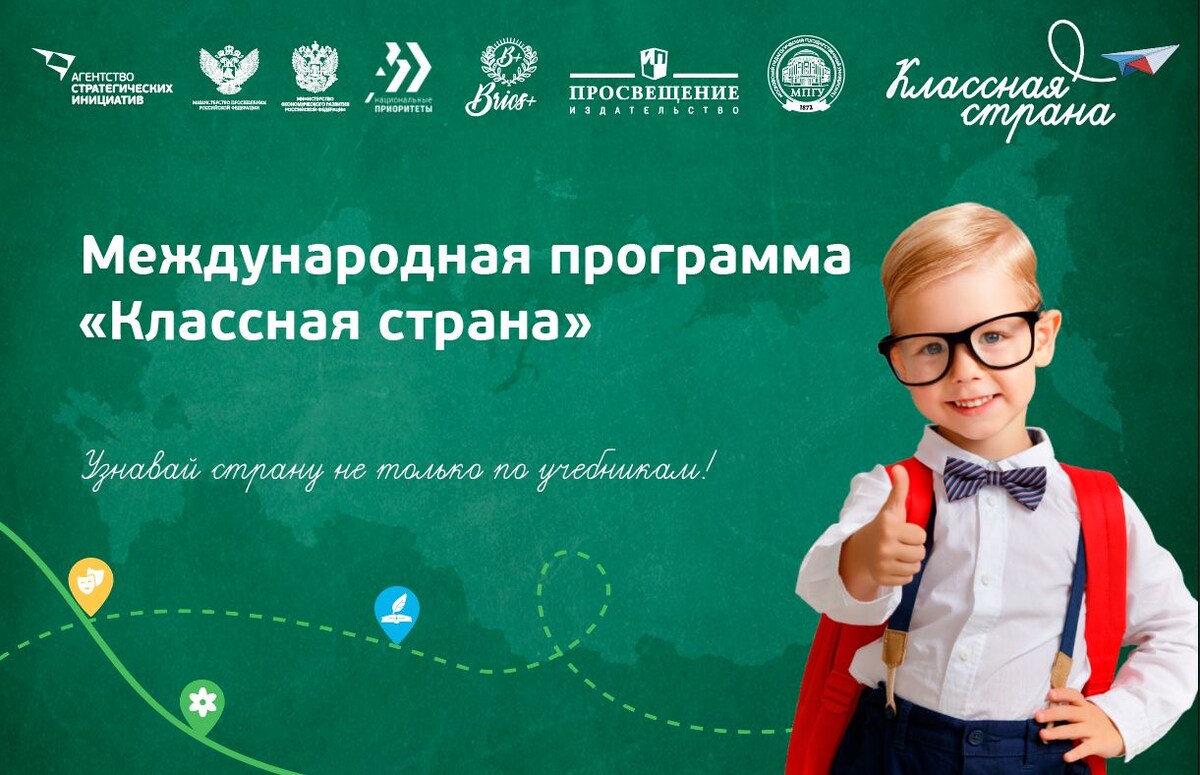 Агентство стратегических инициатив (АСИ) совместно с АО «Просвещение», при поддержке АНО «Национальные приоритеты» и Московского педагогического государственного университета (МПГУ) реализует международную программу по развитию образовательного туризма для детей и молодёжи «Классная страна». Ее целью является формирование модели детского и молодежного образовательного туризма и создание современных, качественных, безопасных и доступных каждому ребенку образовательных программ путешествий, которые расширят кругозор, повысят мотивацию к обучению, помогут осознанно подойти к выбору будущей профессии.