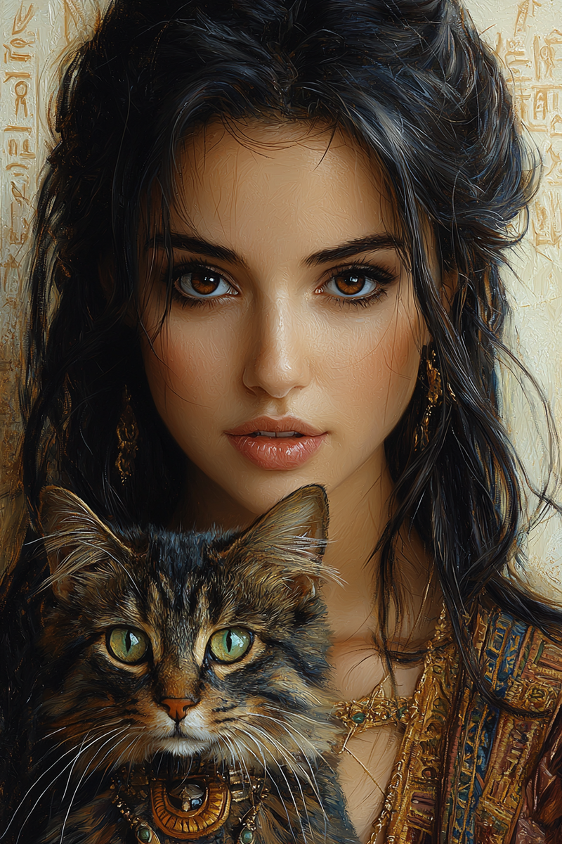 Вдохновением для этой картины послужила загадочная красота древнего Египта. Я хотел запечатлеть не только образ женщины, но и её связь с домашним животным — котом, который был почитаем в египетской культуре. Получилось хорошо. Делюсь промптом и результатом генерации Промпт: Create an oil painting with small brush strokes, focusing on an Egyptian woman accompanied by a cat. Emphasize intricate details and textures in the woman's attire and the cat's features. The background should feature hieroglyphs, enhancing the ancient atmosphere while maintaining a rich color palette of golds and dark tones. Keep it within 850 characters. --q 2 —ar 2:3 —s 1000 —style raw —v 6.1 Понравились картины? Ставьте лайк, оставляйте комментарии и делитесь своими идеями для будущих шедевров!