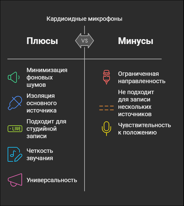 Дорогой кабанчик, диаграмма направленности микрофона определяет, как устройство воспринимает звук с разных направлений, и это напрямую влияет на качество и характер записи . Понимание диаграмм направленности помогает правильно размещать микрофон в зависимости от задачи и минимизировать нежелательные шумы или отражения. Кардиоидные микрофоны обладают диаграммой направленности, которая наиболее чувствительна к звуку спереди и практически не улавливает его сзади . Это делает их идеальными для минимизации фоновых шумов, что особенно важно в условиях студии или на сцене. Благодаря своей способности изолировать основной источник звука, кардиоидные микрофоны эффективно сводят к минимуму нежелательные шумы и отражения . Это особенно полезно при записи вокала в помещениях с плохой акустикой или при необходимости сфокусироваться только на одном источнике звука . Кардиоидные микрофоны часто используются для записи вокала, так как они помогают изолировать голос исполнителя от окружающих шумов .