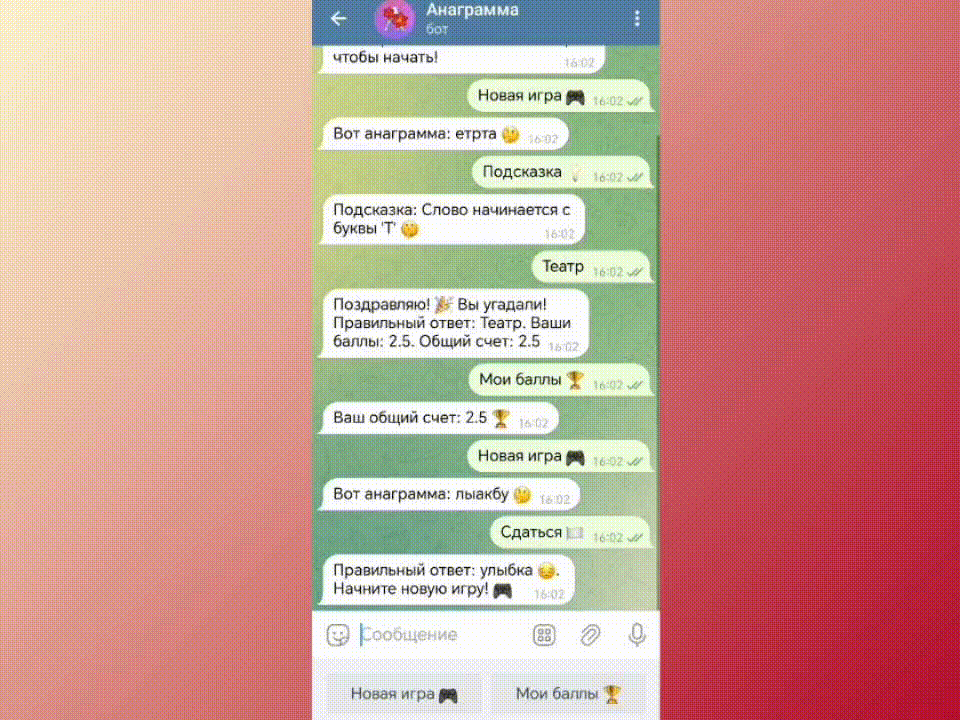 Ура! Ваш Telegram-бот “Анаграмма” готов к игре! 🥳