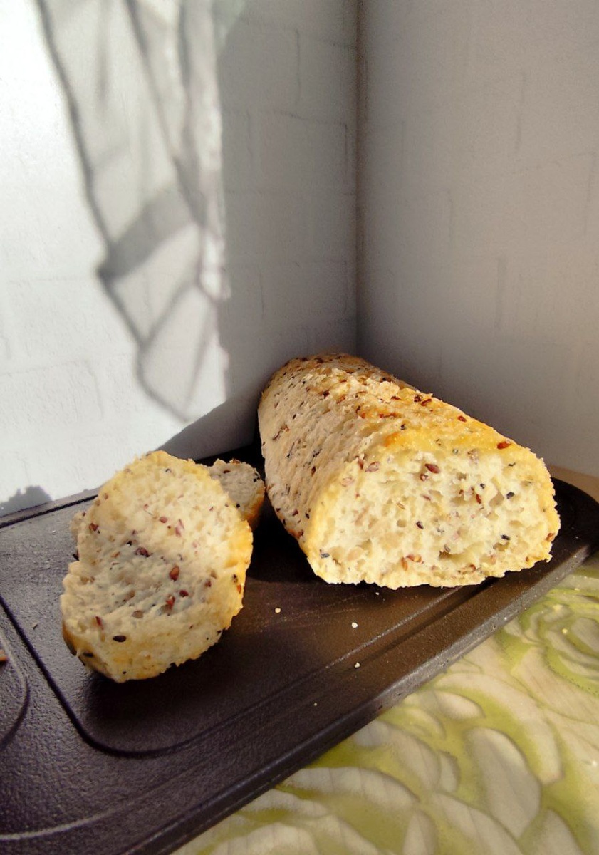 Вот такой вкуснейший фитнес батончик с семечками у меня испекся😍. На фоткала, чтоб расписать рецепт, а рецепта то я точного и не знаю😂😂. Приблизительно состав напишу: Воды 900 мл Молоко 100 мл Дрожжи 1 пакетик сухих с магнита Соль 2 ч.л Сахар 1 ч.л Смесь семян (лен, кунжут белый и черный, тыквенные и подсолнечника) - 200гр Муки столько, чтоб получилось густое липкое тесто. В следующий раз обязательно измерю количество муки. Вначале смешиваем теплую воду, теплое молоко, соль, сахар, дрожжи, семена и 3-4 ст.л муки . Перемешиваем и ставим в теплое место, чтоб опара "заиграла". Когда масса вырастит в объеме в 2-3 раза, добавляем столько муки, чтоб масса получилась густой, но все же липкой. Форму смазать обильно растительным маслом. Я сразу разложила тесто по формам. Ждала, когда поднимется в ней и выпекала при 180°С 35 минут. Но можно сделать и как принято, чтоб тесто поднялось ещё раз в чашке, потом разложить его по формам и далее по порядку. Мой упрощённый способ ни чем не